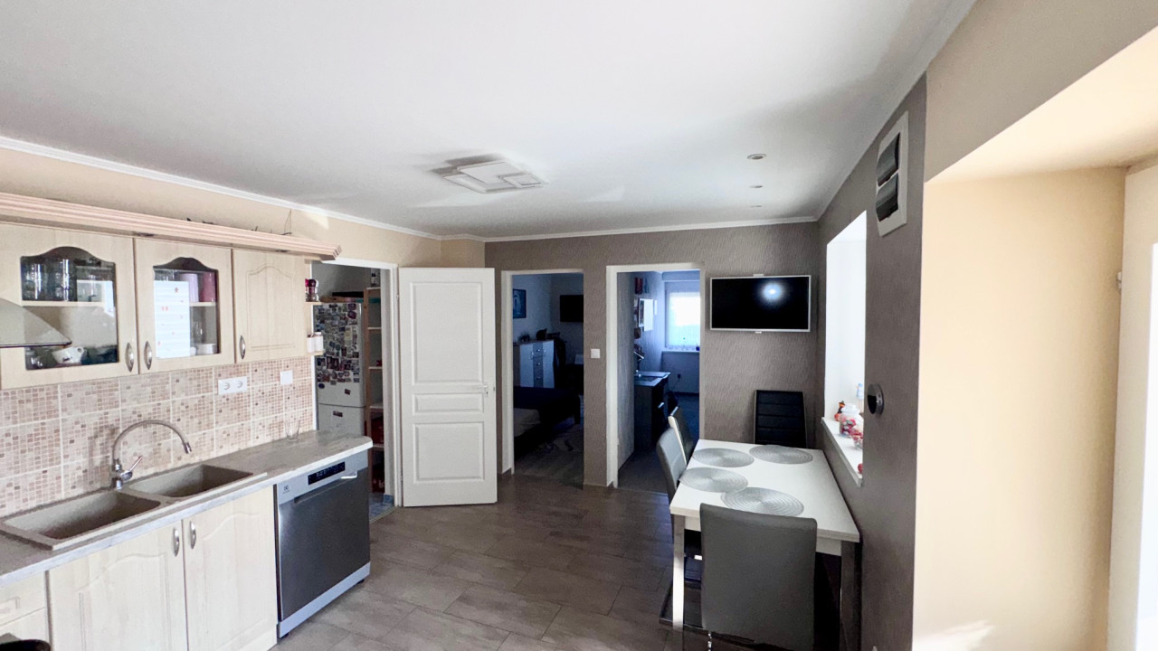 A 95 nm alapterületű családi ház elosztása kiváló, tágas konyha - étkező - spájz, előszoba valamint három nagyszoba, fürdőszoba, WC -vel valamint egy plusz külön mellékhelyiség is ki lett alakítva.