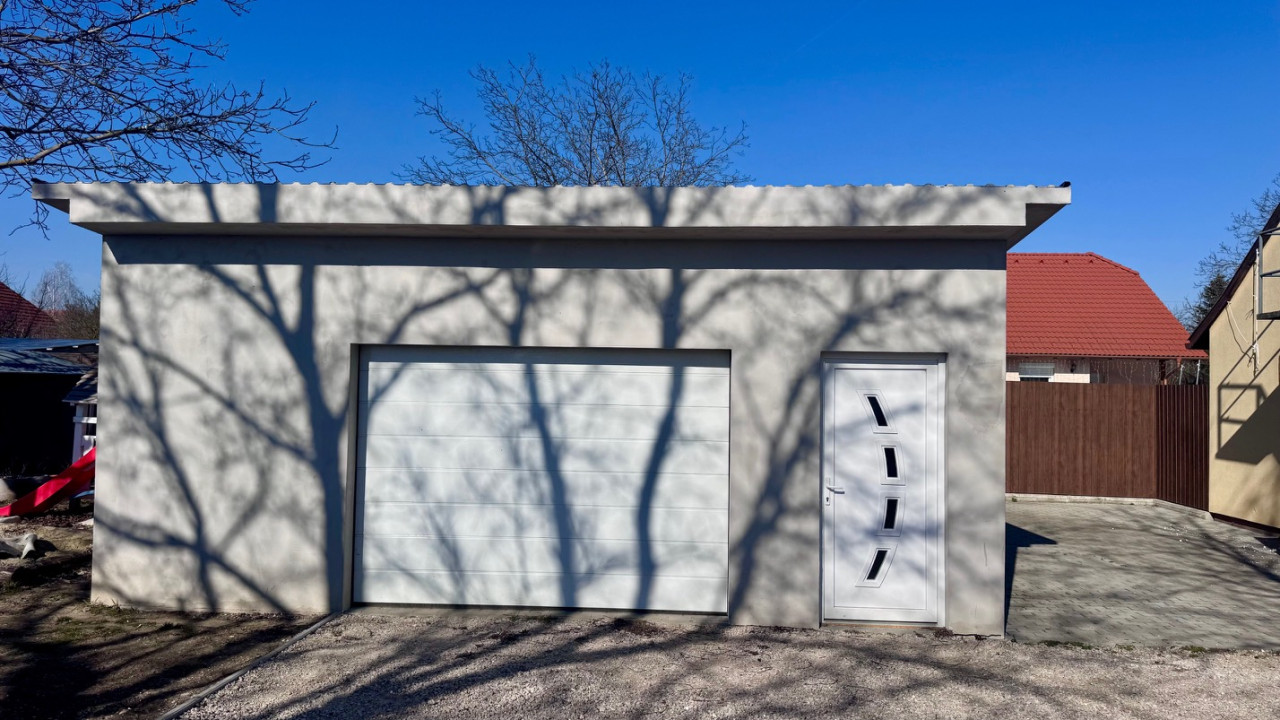 A telken 2023-ban felépítésre került még egy 50 nm alapterületű dupla garázs mely szintén szigetelt, itt is bevezetésre került a villany valamint víz és szennyvíz kiállássál is rendelkezik, akár tárolónak akár két gépjármű kényelmes parkolását biztosítva.