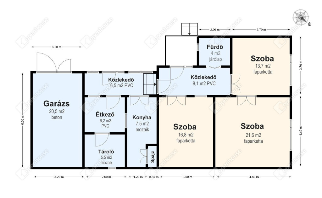 - nettó 91 m2 hasznos alapterületű ház + 6 m2 fedett terasz + 20,5 m2-es garázs