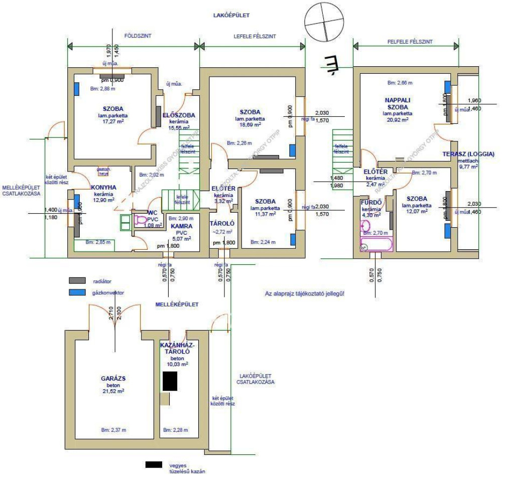 Fűtés: vegyes tüzelésű kazán radiátorokkal, plusz a legtöbb helyiségben gázkonvektor is.