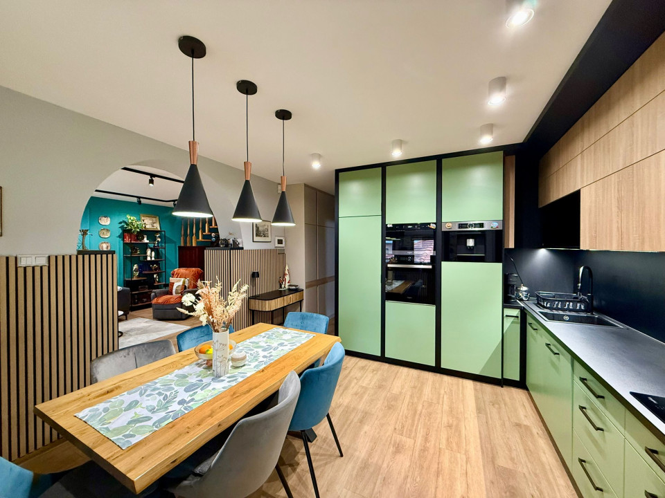 Modern, magas minőségű, beépített, gépesített konyhabútorral.