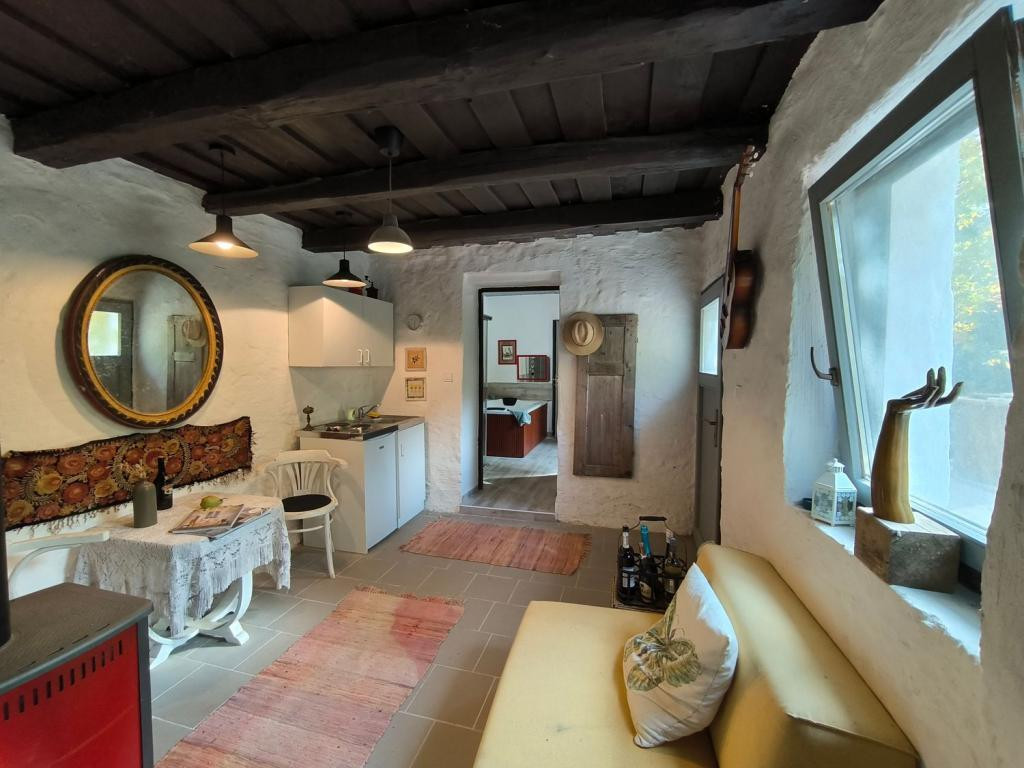 A másik épületben egy szoba, konyha , reggeliző sarok található, amelyet szintén a rusztikus hangulat és a természetes anyaghasználat jellemez.