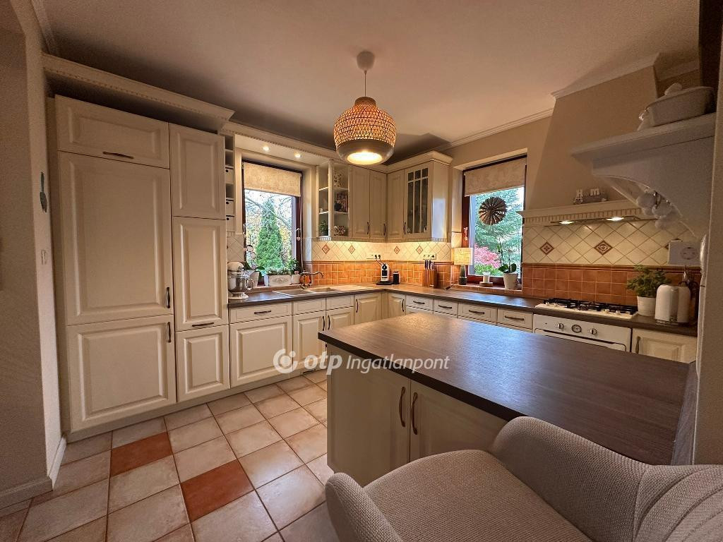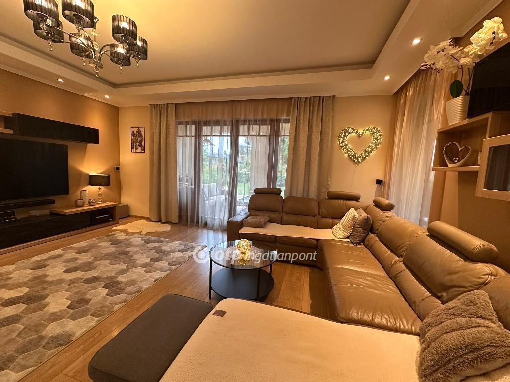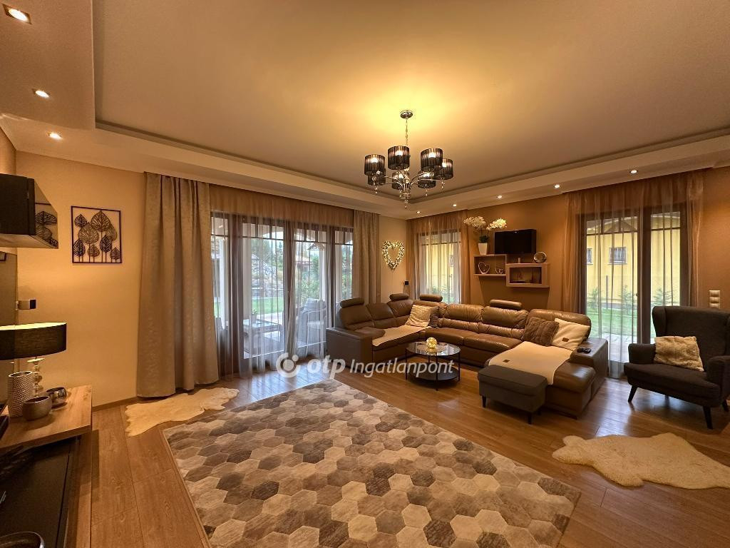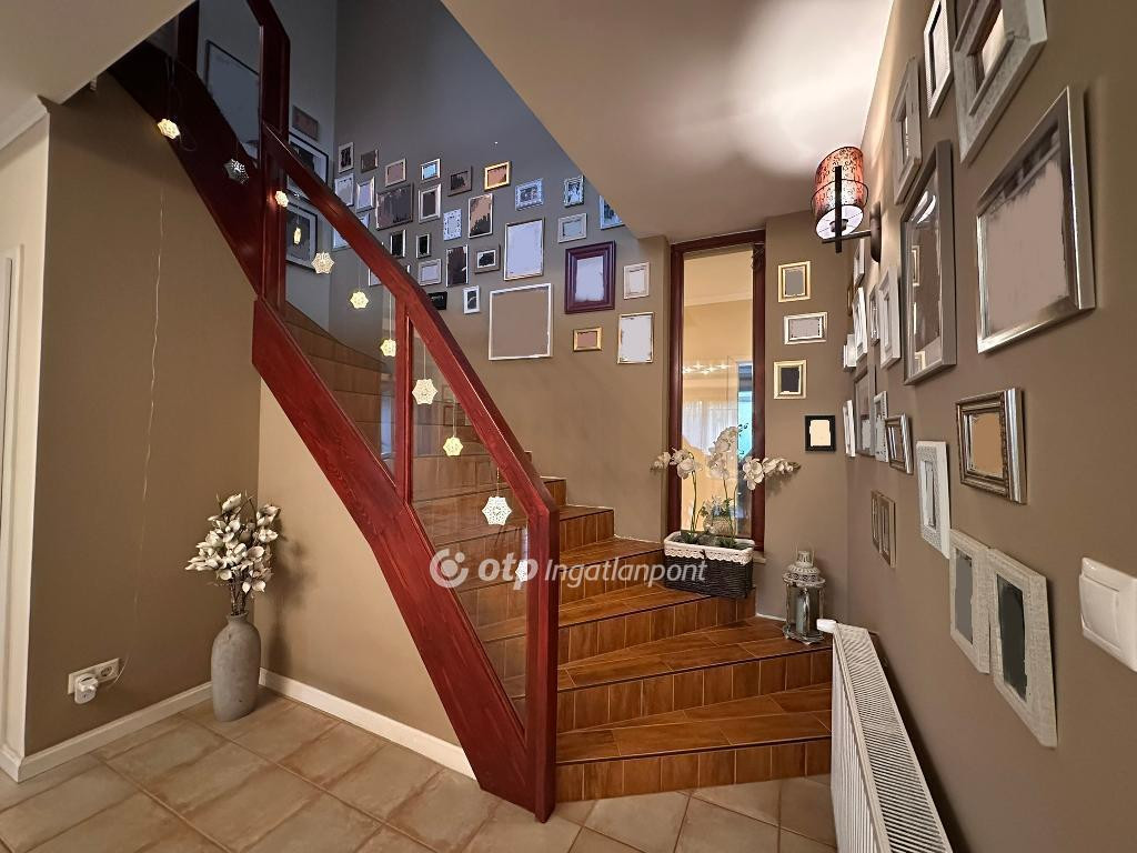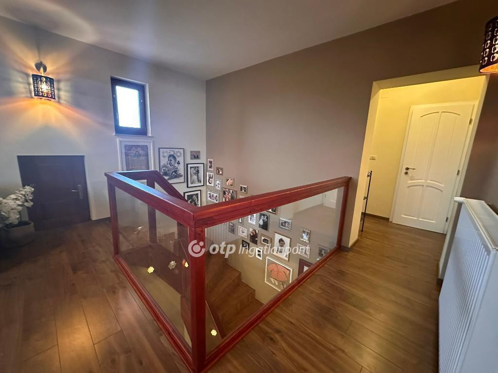 A belső elrendezés szerint a fölszinten lévő étkező és nappali is egyaránt 32 ? 35 m2, kényelmes és tágas, az étkező mellett van az emelet feljárat és garázshoz való lejárat. A konyha egy légtérben funkciónál az étkezővel. A nappali közvetlenül a kertre néz és egy 62 m2-es terasz veszi körbe. A földszinten kapott helyet egy hálószoba gardróbbal, egy dolgozó szoba, és egy vendég szoba is. A földszinti fürdőben zuhanyzó és kád is van. A mosókonyha egy praktikus külön helységben kapott helyet. Az emeleten teljesen el lehet különíteni akár a gyerekeket, akár a hozzánk látogató vendégeket. 2 hálószobához és egy fürdőszobához egy nagy légterű második nappali tartozik. A hálószobákból közös terasz nyílik, pazar kilátással a csodálatos kertre.