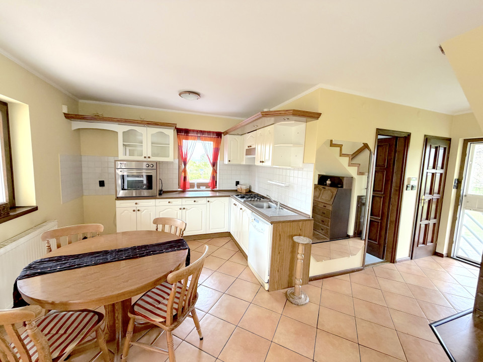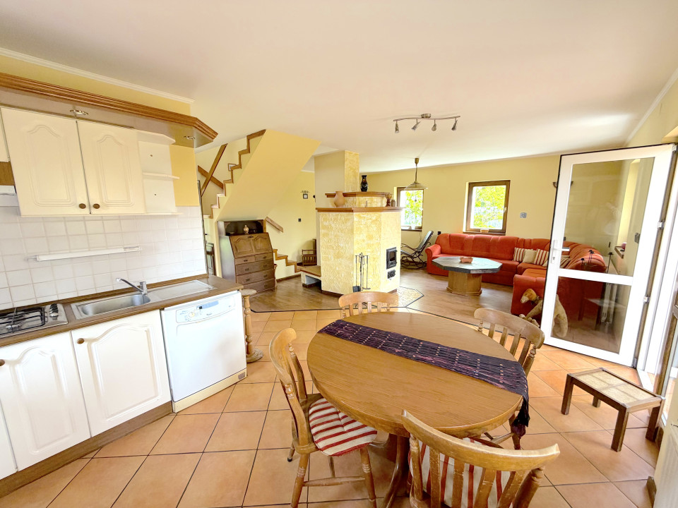 A ház központi élettere a világos, egyterű nappali–étkező–konyha, amelyből gyönyörű kilátás nyílik a kertre. A nappali hangulatát és a ház fűtését egy vízteres, fatüzelésű kandalló biztosítja. Az épület 15 cm külső szigeteléssel rendelkezik.