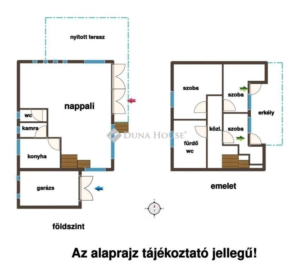 A földszinten tágas, napfényes nappali (32 m2), konyha, kamra és wc - kézmosóval lett kialakítva, az emeleten három félszoba és fürdőszoba - wc található.
