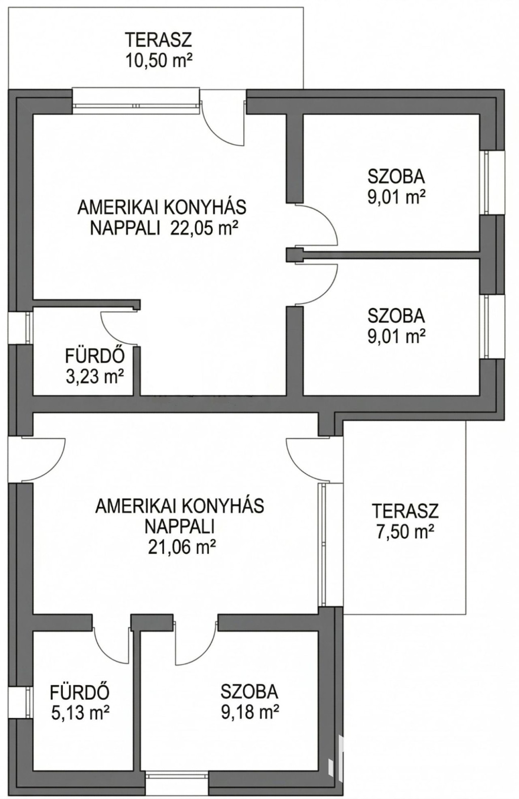- Nagyobb lakóegység 47 m2: Amerikai konyhás nappali (egyedi, gépesített bútorral), 2 hálószoba, fürdőszoba és saját fedett terasz.