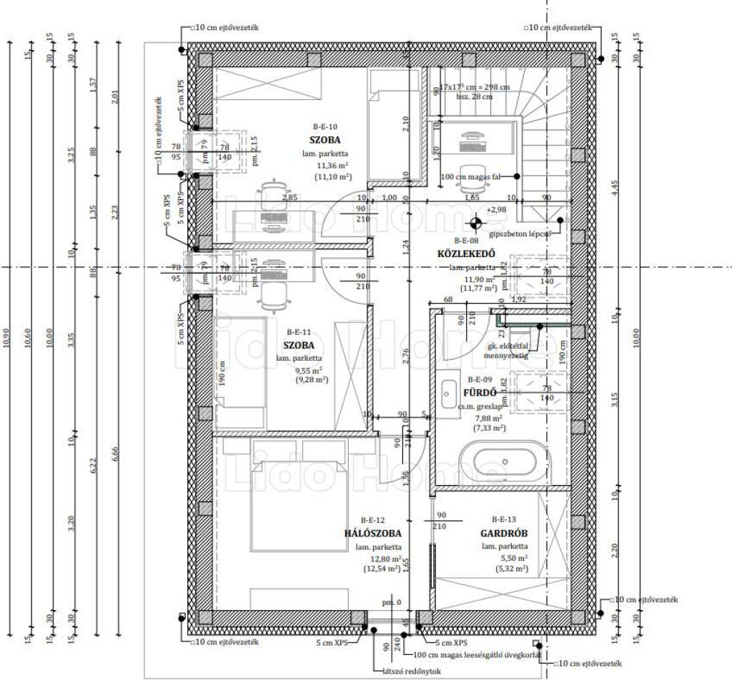 • belső válaszfalak 12,5 cm kőzetgyapot hangszigeteléssel szigetelt 2 rétegben zárt gipszkarton falak, falakba jól átgondolt rögzítés elősegítése 18mm OSB lappal szerelve, fehér színre festve,