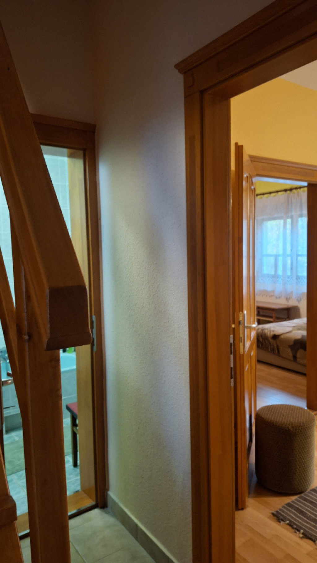 A földszint nappalija a kertből is elérhető, ahonnan körbejárhatóan konyha; két nagyméretű, déli fekvésű szoba; fürdőszoba; külön mellékhelyiség; lépcsőház elosztású tereit a keleti bejárat felől fedett terasz teszi teljessé. Emeletén az előtérből két szoba, másik oldalán a Balaton felé néző, igényesen burkolt, kő korláttal kerített , félköríves nyitott terasz vár minket.