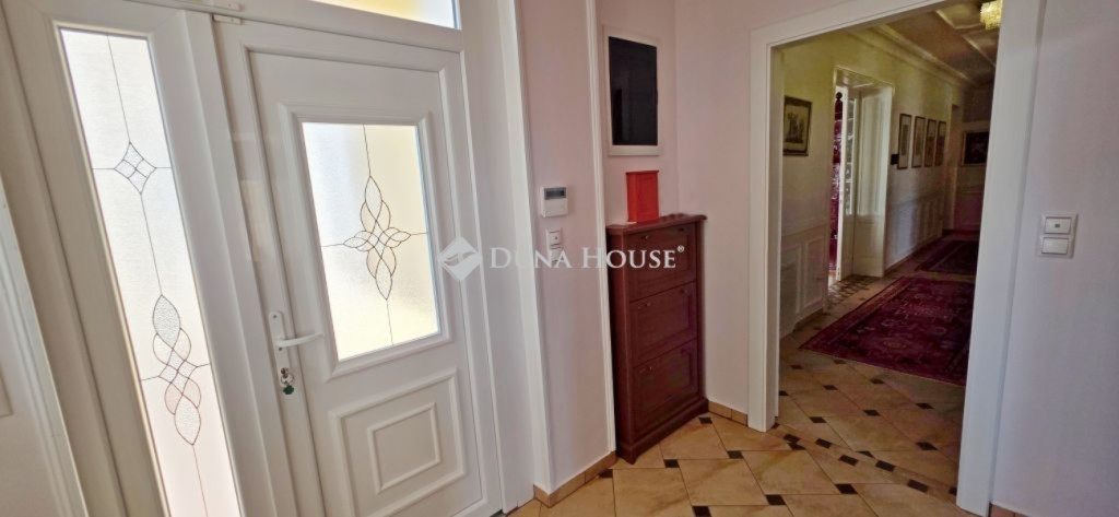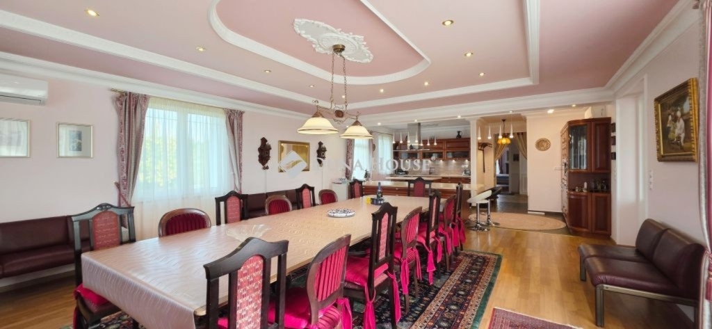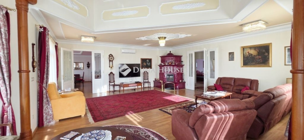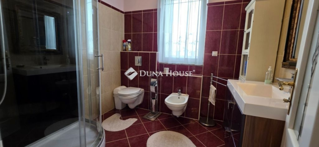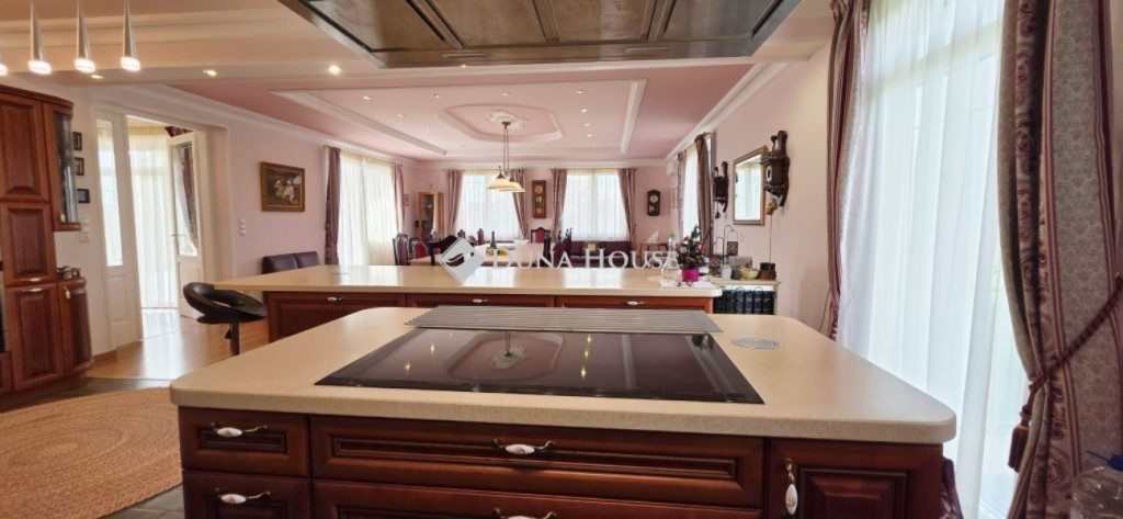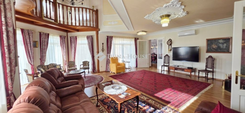A lakótér nettó 228,4 m2, melyhez kapcsolódik egy 27 m2-es nyugati és egy 53 m2-es keleti tájolású terasz.Az épület alagsorában 3 állásos garázs került kialakításra, továbbá itt található a gépészeti helyiség és egy tusolóval, wc-vel is ellátott háztartási helyiség.A lakótérbe az akadálymentesített bejutást egy háromszemélyes lift biztosítja. Jelenlegi kialakításában nappali+3 szoba, 3 fürdőszoba kapott helyet, de nagyobb családok számára akár további 2 szoba is könnyedén leválasztható a nagyobb terekből.A konyha magasan felszerelt, a sütőn kívül pároló, mikró, kávégép, melegentartó, mosogatógép, dupla méretű főzőlap, elszívó is beépítésre került.A nappali éke az épített cserépkályhán kívül a déli oldalon található galériázott nyitott födémrész is, mely igazán különlegessé teszi a teret.A két fő hálószoba 20-20 m2-es, melyek saját fürdőszobákkal rendelkeznek és egy gardrób köti össze őket.A harmadik hálószoba is közel 18 m2-es, külön fürdővel.A hatalmas terasz mind a három szobából elérhető.A vendégekre gondolva az udvarban egy 65 m2-es ház is megépítésre került, mely saját terasszal szoba-konyha-fürdő helyiségekkel rendelkezik, a tetőn napelem is megtalálható.Még itt is 3 rétegű, hőszigetelt fa nyílászárók kerültek beépítésre.Természetesen a kert gondozásához szükséges szerszámtároló is rendelkezésre áll 25 m2-en külön épületben.A terasz mellett egy támfallal körbeölelt helyen egy medencének alkalmas hely lett kialakítva, melyhez a gépészeti része elő lett készítve.A ház két oldalán két ciszterna biztosítja a vízellátást a kiépített öntözőrendszerhez.Az ingatlanban minden részletre nagy figyelmet fordítottak.Hőszigetelt fa szerkezetű nyílászárók mindenhol elektromos redőnnyel, rovarhálóval, márvány párkánnyal szerelve.A fűtés kondenzációs gázkazánról padlófűtéses hőleadással biztosított.A nappaliban, a konyhában és az étkezőben klíma biztosítja a nyári hónapok komfortos hűtését.Az épület biztonságáról kiépített riasztó és kamerarendszer gondoskodik, nyílászáróknál beépített nyitás érzékelőkkel.Az utcafrontról külön az épület és külön a kert is elektromos kapukon keresztül közelíthető meg.Az ingatlan tehermentes, jogilag rendezett tulajdonosi hátterű, viszonylag gyorsan birtokba vehető.Rengeteget tudnék még mesélni, de inkább tekintse meg a képgalériát és hívjon.További információkért és megtekintéssel kapcsolatban keressen bizalommal!