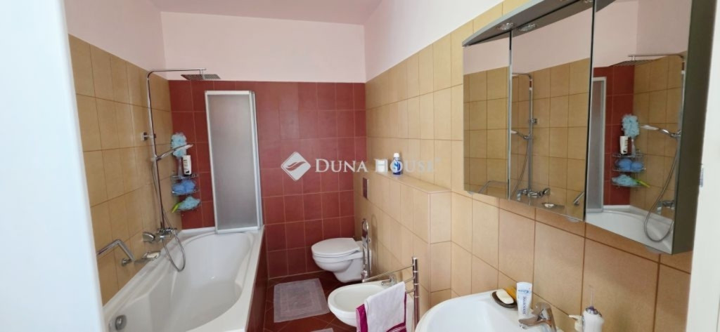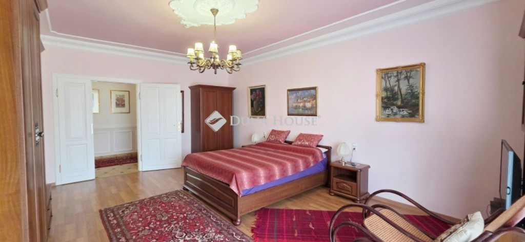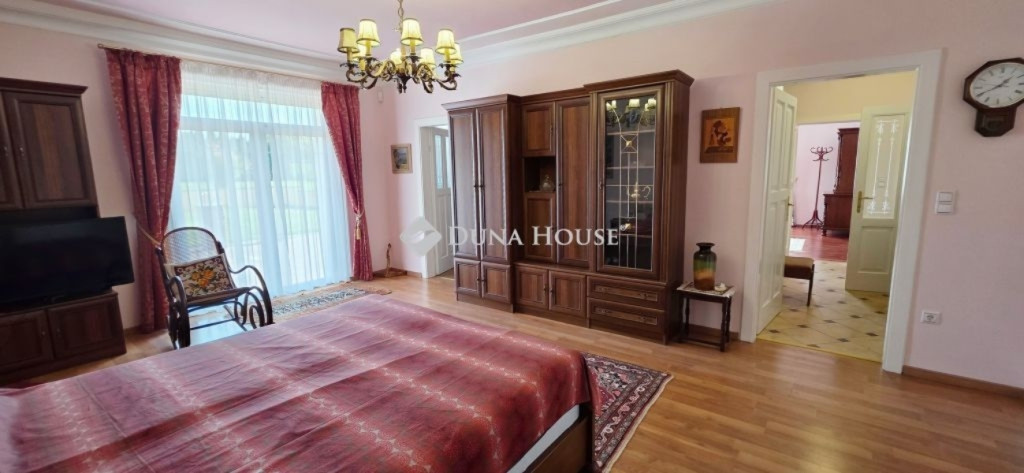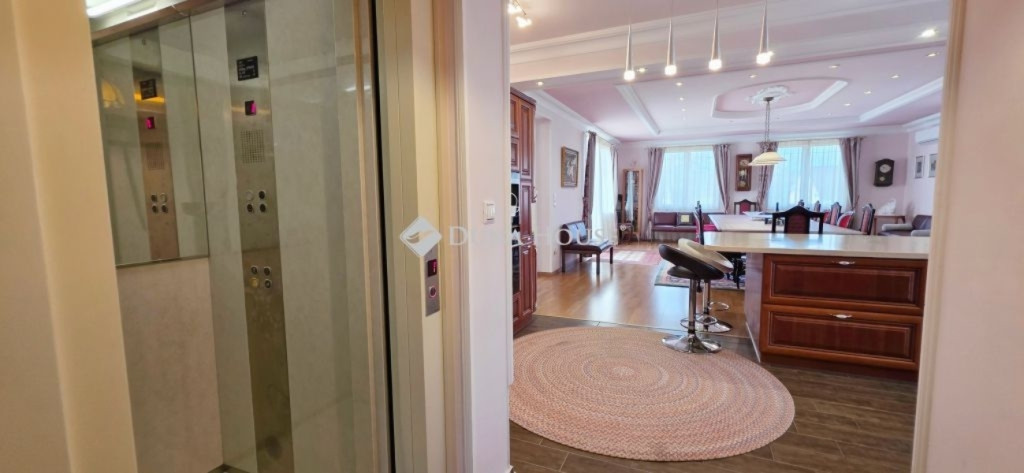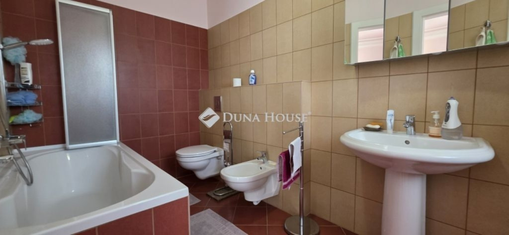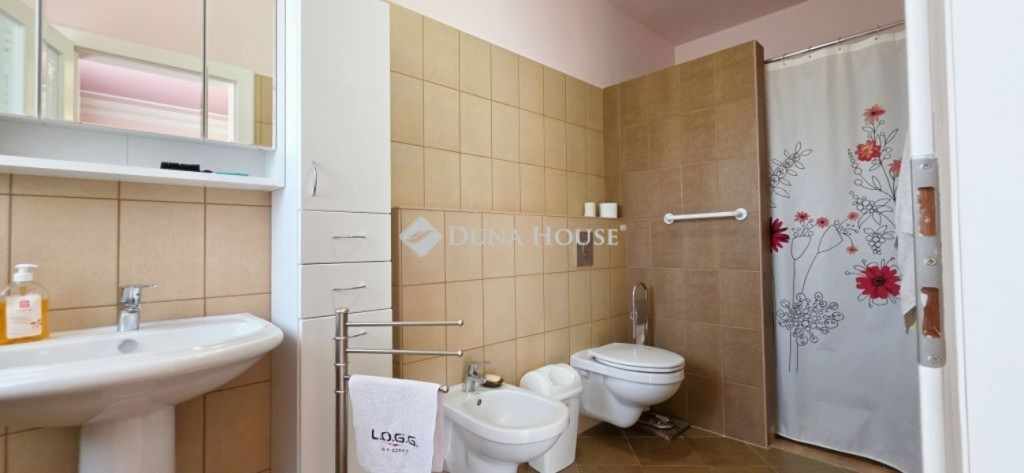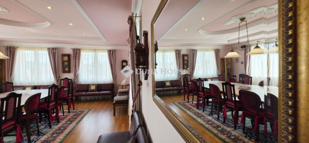 A lakótér nettó 228,4 m2, melyhez kapcsolódik egy 27 m2-es nyugati és egy 53 m2-es keleti tájolású terasz.Az épület alagsorában 3 állásos garázs került kialakításra, továbbá itt található a gépészeti helyiség és egy tusolóval, wc-vel is ellátott háztartási helyiség.A lakótérbe az akadálymentesített bejutást egy háromszemélyes lift biztosítja. Jelenlegi kialakításában nappali+3 szoba, 3 fürdőszoba kapott helyet, de nagyobb családok számára akár további 2 szoba is könnyedén leválasztható a nagyobb terekből.A konyha magasan felszerelt, a sütőn kívül pároló, mikró, kávégép, melegentartó, mosogatógép, dupla méretű főzőlap, elszívó is beépítésre került.A nappali éke az épített cserépkályhán kívül a déli oldalon található galériázott nyitott födémrész is, mely igazán különlegessé teszi a teret.A két fő hálószoba 20-20 m2-es, melyek saját fürdőszobákkal rendelkeznek és egy gardrób köti össze őket.A harmadik hálószoba is közel 18 m2-es, külön fürdővel.A hatalmas terasz mind a három szobából elérhető.A vendégekre gondolva az udvarban egy 65 m2-es ház is megépítésre került, mely saját terasszal szoba-konyha-fürdő helyiségekkel rendelkezik, a tetőn napelem is megtalálható.Még itt is 3 rétegű, hőszigetelt fa nyílászárók kerültek beépítésre.Természetesen a kert gondozásához szükséges szerszámtároló is rendelkezésre áll 25 m2-en külön épületben.A terasz mellett egy támfallal körbeölelt helyen egy medencének alkalmas hely lett kialakítva, melyhez a gépészeti része elő lett készítve.A ház két oldalán két ciszterna biztosítja a vízellátást a kiépített öntözőrendszerhez.Az ingatlanban minden részletre nagy figyelmet fordítottak.Hőszigetelt fa szerkezetű nyílászárók mindenhol elektromos redőnnyel, rovarhálóval, márvány párkánnyal szerelve.A fűtés kondenzációs gázkazánról padlófűtéses hőleadással biztosított.A nappaliban, a konyhában és az étkezőben klíma biztosítja a nyári hónapok komfortos hűtését.Az épület biztonságáról kiépített riasztó és kamerarendszer gondoskodik, nyílászáróknál beépített nyitás érzékelőkkel.Az utcafrontról külön az épület és külön a kert is elektromos kapukon keresztül közelíthető meg.Az ingatlan tehermentes, jogilag rendezett tulajdonosi hátterű, viszonylag gyorsan birtokba vehető.Rengeteget tudnék még mesélni, de inkább tekintse meg a képgalériát és hívjon.További információkért és megtekintéssel kapcsolatban keressen bizalommal!
