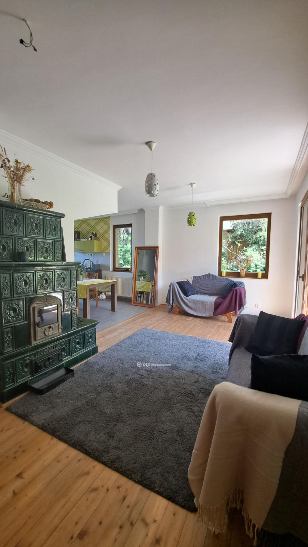 Amerikai konyhás nappali, fatüzelésű cserépkályhával