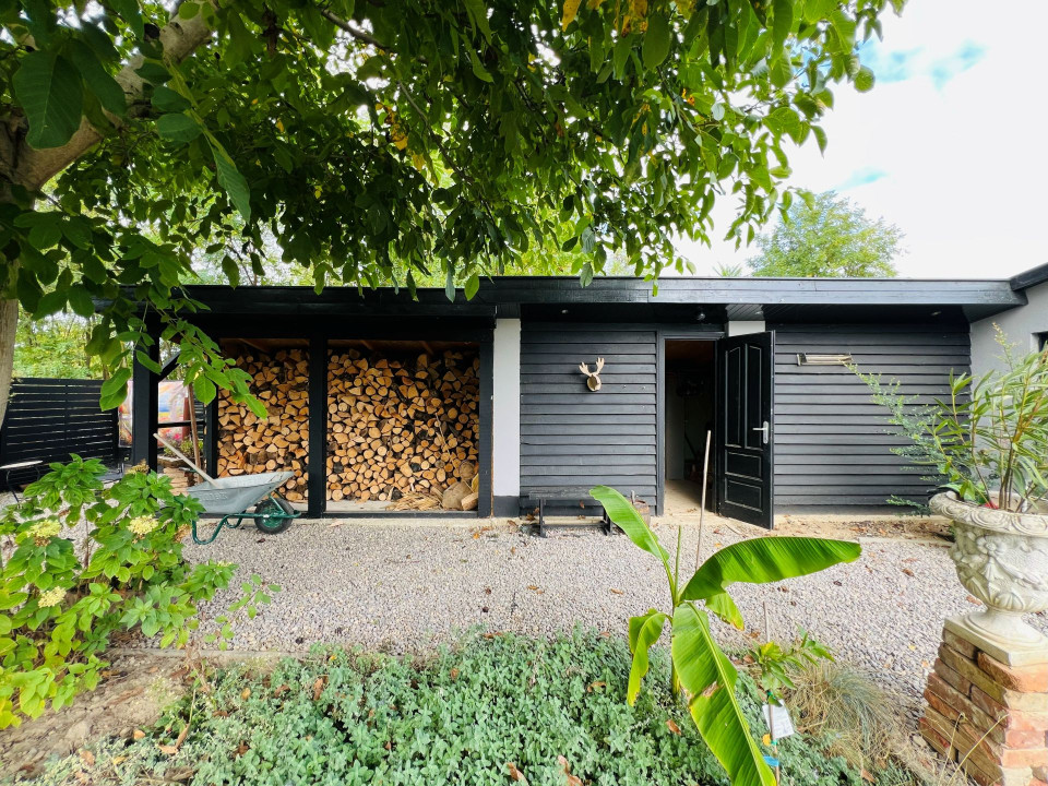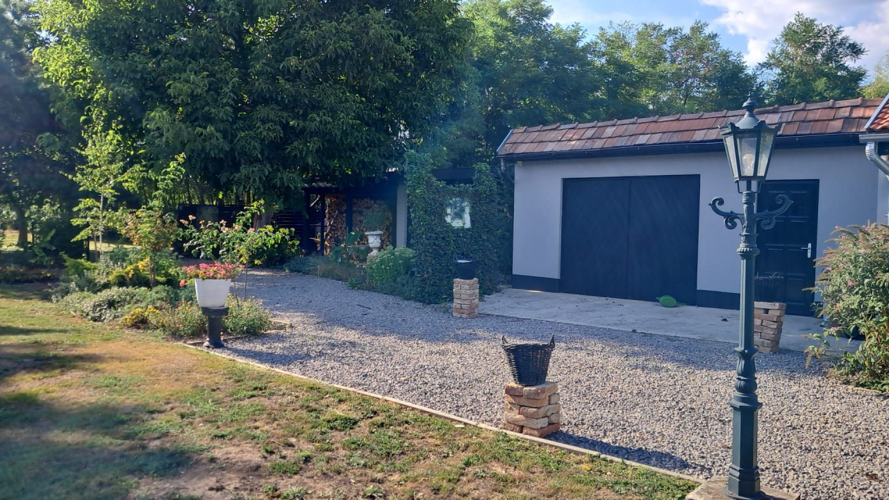 Telek: Az udvar tágas és gondozott, virágokkal, cserjékkel és bokrokkal díszített, teljes egészében körbekerített terület, amelyet rendezett szegéllyel határolt járda tesz még ápoltabbá. A hatalmas kert számtalan lehetőséget kínál a szabadidő eltöltésére: ideális hely a pihenéshez, grillezéshez, kertészkedéshez vagy akár kisebb gazdálkodáshoz is. A telken dupla garázs és fatároló található, a hátsó bejáratnak köszönhetően pedig az ingatlan autóval erről az oldalról is kényelmesen megközelíthető, lehetővé teszi lakókocsi beállását is, így a terület vendégek fogadására vagy hosszabb tartózkodásra is kiválóan alkalmas. A kert hátsó részén gondosan ápolt gyümölcsfák sorakoznak, tovább fokozva a természetközeli, vidéki atmoszférát.