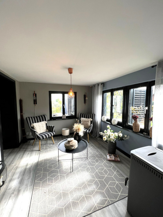 Az ingatlan jellemzői: A főbejáraton át egy világos közlekedőbe érkezünk, ahonnan minden helyiség könnyen megközelíthető. Innen jutunk el a fényes, jelenleg olvasótérként használt előszobába, amelyből nyílik a modern, gépesített konyha étkezővel, valamint az egyik barátságos hálószoba. A közlekedő másik irányába található a zuhanyzós fürdőszoba WC-vel, egy külön helyiség, amelyet most mosókonyhaként használnak, továbbá a nagy belmagasságú, rendkívül világos nappali, amely a ház központi tere. Innen közelíthető meg a másik, tágas és kényelmes hálószoba is. A fa nyílászárók tovább erősítik a ház természetes, otthonos hangulatát.