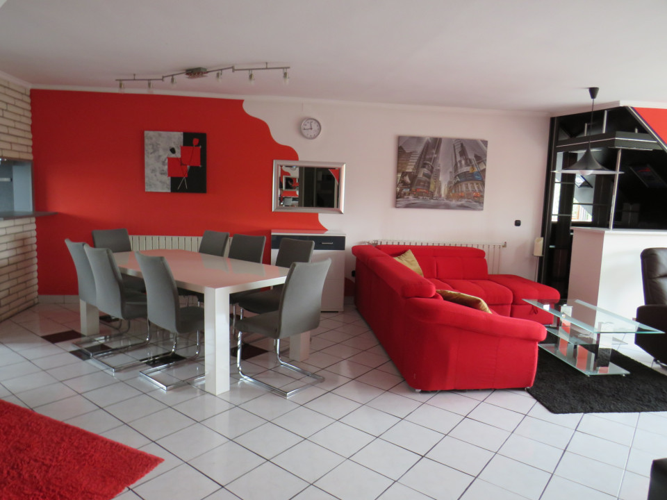 Az Emeleti, külön bejáratú lakás 107 m2 tágas étkező nappali, külön konyha 2 hálószoba, kamra, 2 gardrób ,fürdőszoba, wc, előszoba, közlekedő és 13,6 m2 déli tájolású nappaliból megközelíthető erkély alkotja.