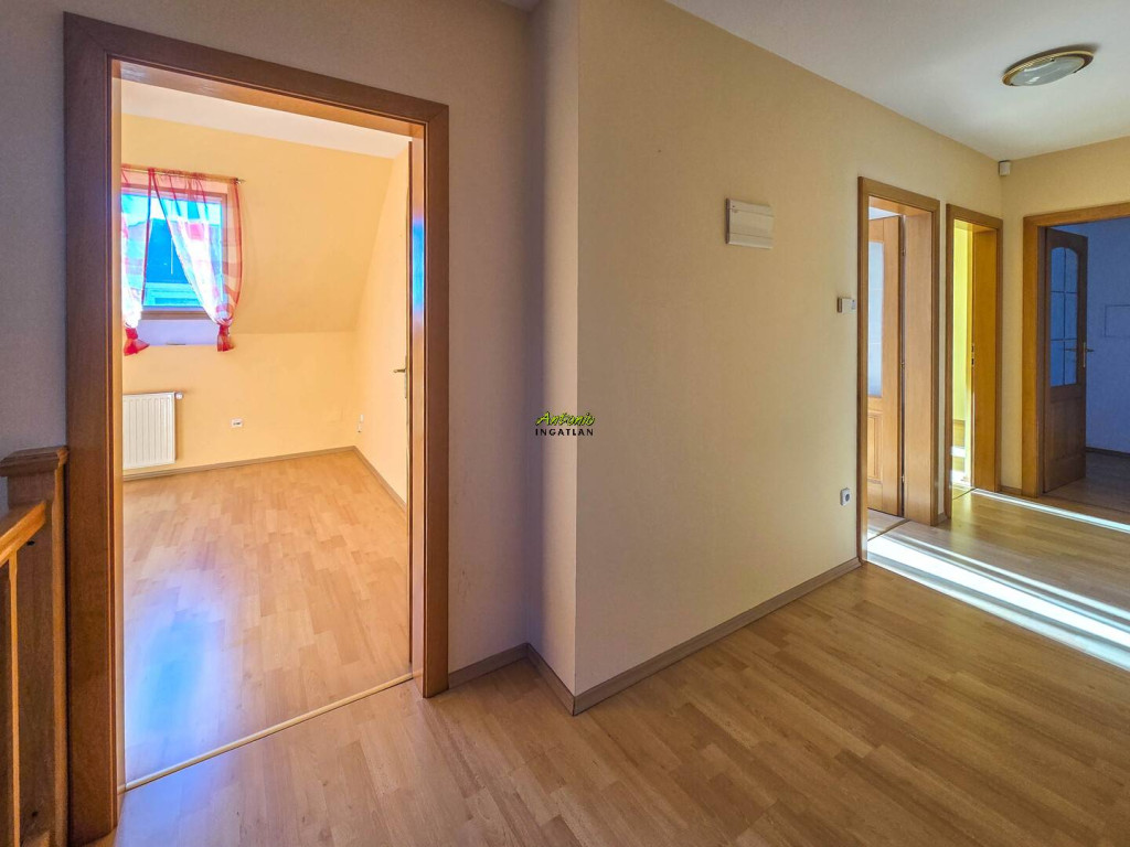 Elosztása: fszt: nappali, külön konyha, 1 hálószoba és egy kisebb szoba, kamra, fürdő, wc, előszoba, míg az emeleten 3 hálószoba, egy konyha, fürdő wc-vel és egy gardób szoba, előszoba.