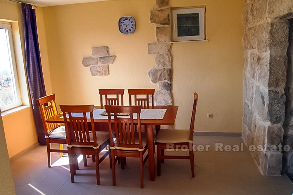For sale is a completely renovated stone house with excellent views of the city of Split, islands and hills. In the old Dalmatian village, in the historic Republic of Poljica, this beautiful renovated stone house on three floors is located. This idyllic place is well known for its good homemade food, beautiful nature and excursion and cycling trails, and a famous star observatory. The house consists of three floors, a basement, ground floor and a high attic. Throughout the house there is a high quality chimney to which a fireplace in a tavern and a fireplace in the living room are connected. The tavern with wooden entrance doors and a beautiful fireplace is the right place to enjoy the old Dalmatian customs. On the ground floor there is a toilet, living room, kitchen and dining room. All are decorated in authentic style and are fully furnished. The fireplace stove gives a very pleasant ambiance. On the third floor there are practical and beautiful interior wooden stairs. There are three bedrooms, a bathroom and a balcony with great views of the sea, the islands, Split and the surrounding area. Peace and quiet of this location really impress. The shop is nearby, the bus stop for Split as well, and restaurants with quality autochtonous food are a real treat. Hiking trails, bicycle trails, astronomers, beautiful nature … and the city of Split is only a 20-minute drive away. Great property for anyone who likes nature and not far from popular Split. It’s being sold fully furnished. BROKER REFERENCE ID:2019/74