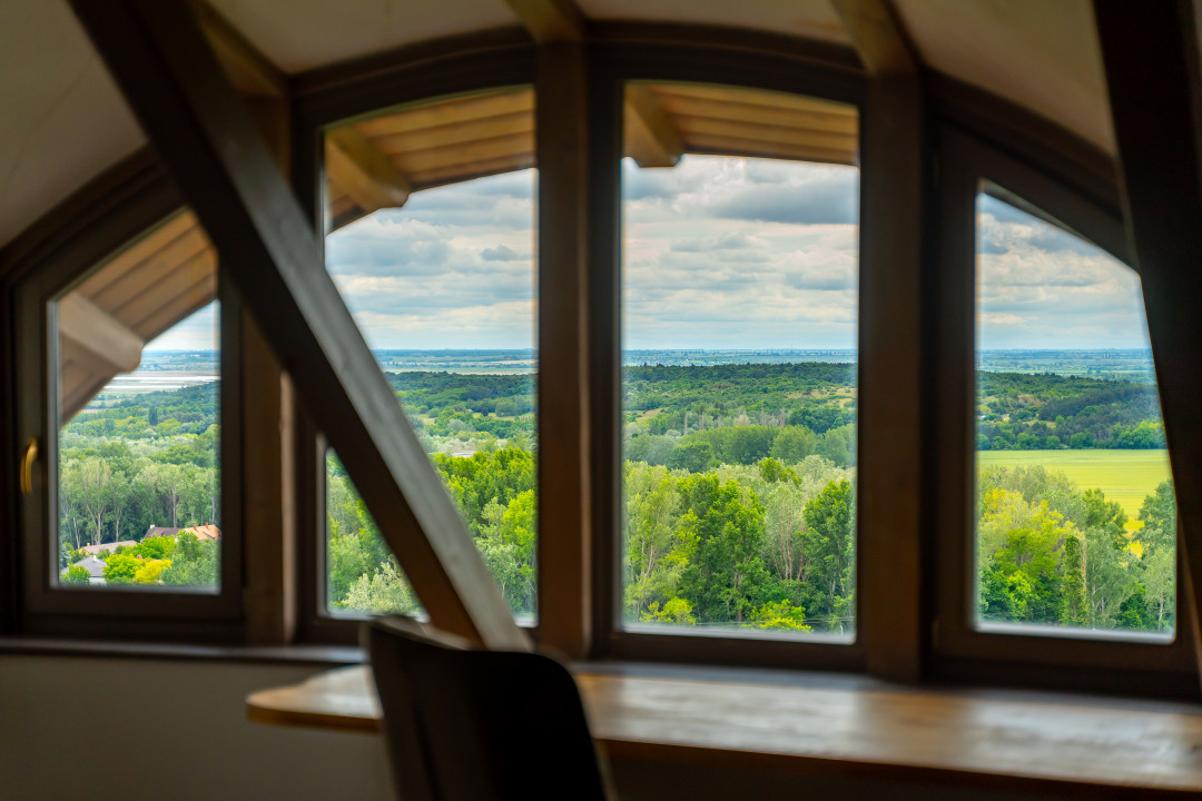 Az épület organikus, íves formavilága, a természethez igazodó anyaghasználat (agyagvakolat, tölgyfa, mész-gipsz, kerámia, nád tető) és a különleges ragasztott faszerkezetek természetes módon egyedülálló légkört teremtenek. A kápolnaszerű, monumentális nappali tér és az úszó lengő galéria (45 m²) nem csak vizuálisan lenyűgöző, de a katedrális akusztikát idéző belső tér zeneművészeti eseményekre is alkalmas.