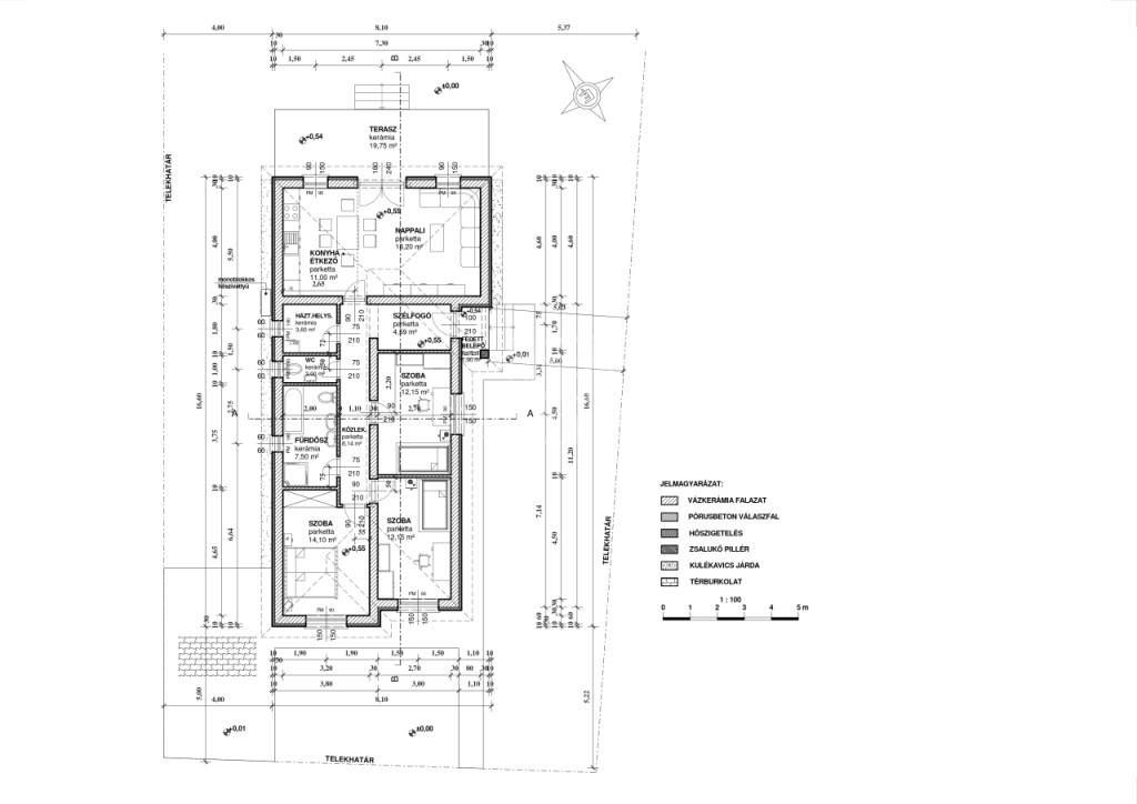 A tartószerkezeti falak Porotherm P30N+F téglából, betonkoszorúval, fa födémes tetőszerkezettel készülnek. A lábazat 10 cm polisztirol lépésálló, a homlokzatok 10cm-es Austrotherm Grafitos, a vízszintes födém 25 cm ásványgyapot szigeteléssel lesz ellátva.