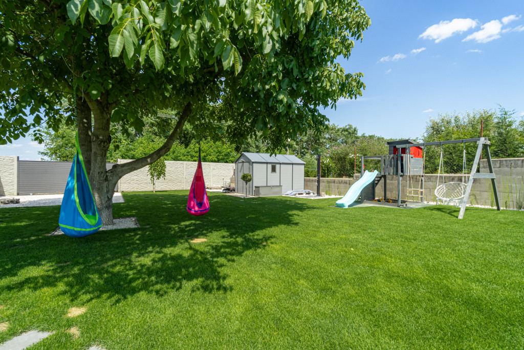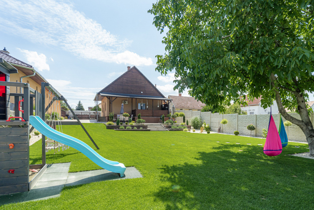 A 773 m²-es telek két utcáról is megközelíthető, és gondosan parkosított, rendezett kertjével igazi kertvárosi hangulatot kínál. Automata öntözőrendszer látja el a növényeket fúrt kútról, a friss gyepszőnyeg vakondhálóval védett, a kertben játszórész, kerti zuhany, kutyakennel és egy tágas kerti tároló teszi teljessé a kert kényelmét.