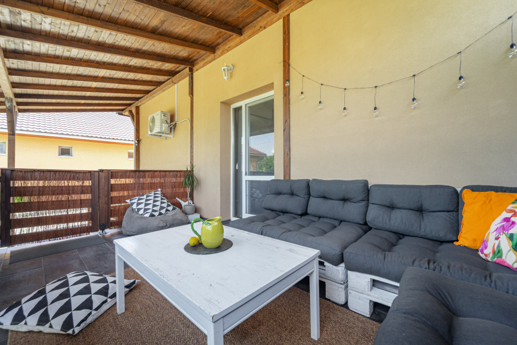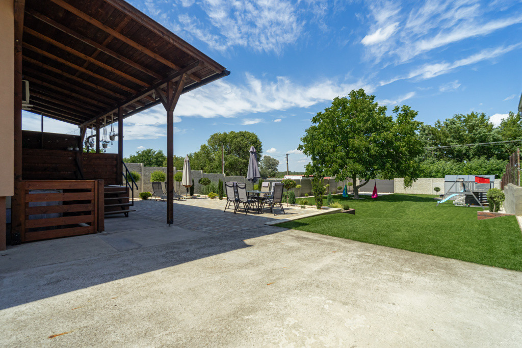 A nappaliból egy 16 m²-es fedett teraszra léphetünk ki, amely kellemes helyszínt biztosít pihenésre vagy vendégfogadásra. A házhoz tartozó 32 m²-es, száraz, szigetelt pince pedig kiváló lehetőség tárolásra vagy akár hobbihelyiség kialakítására. A tetőtér beépíthető, így a ház igény szerint tovább is bővíthető.
