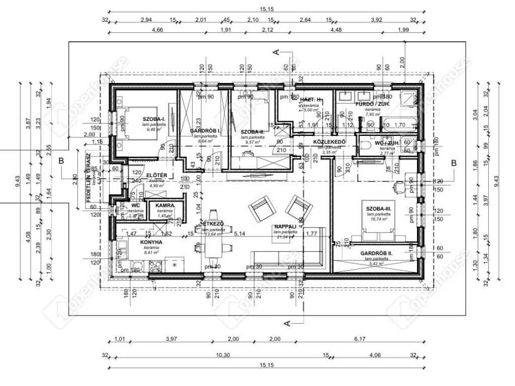 - Helységenként: 4 db konnektor + 1 db villanykapcsoló + 1 db mennyezeti lámpa