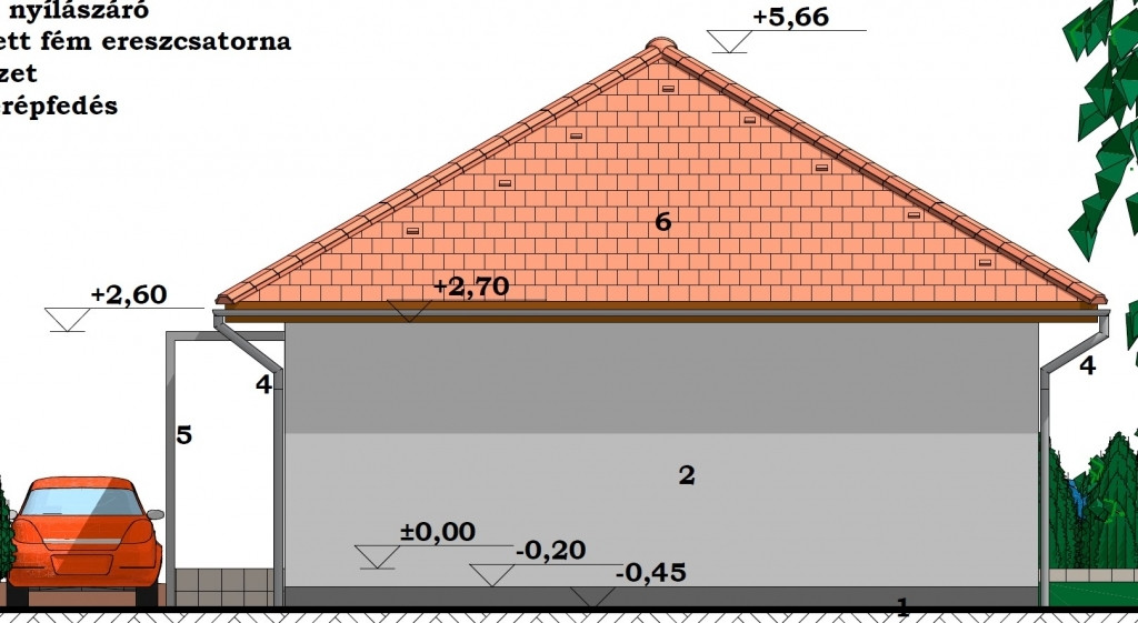 A tetőszerkezet két állószékes, cserép fedéssel.