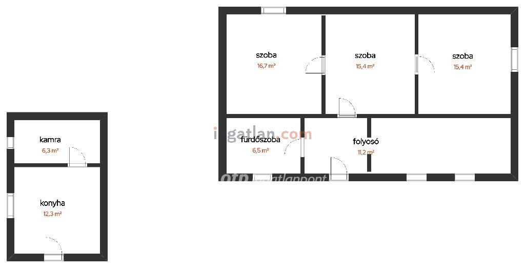 Az ingatlan főépületében megtalálható három szoba, fürdőszoba-wc, folyosó. Szemben a főépülettel, külön házrészben helyezkedik el a konyha és az éléskamra.