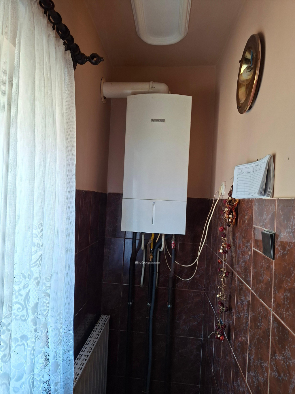 A ház fűtése gázcirkóval, lapradiátorokkal történik, de a gázkonvektorok is működőképesek.