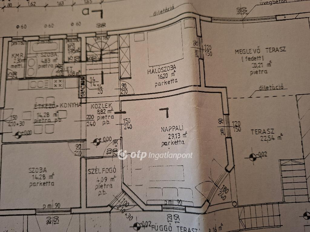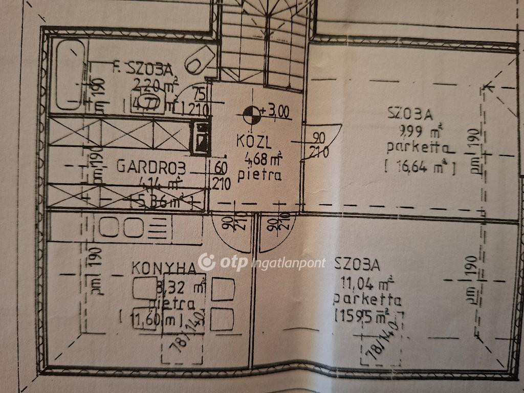Az ingatlan tetőtér beépítésű, amelyből 93,6 m2 a lenti rész, a tetőtér 44,4 m2 nagyságú.