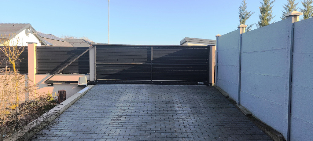 A ház előtt és a telek oldalsó részén kocsibeálló került kialakításra, elektromos tolókapukkal. A garázskapu szintén elektromos mozgatású. A saroktelek prémium, gondozásmentes alumínium betétes kerítéssel körbekerített.