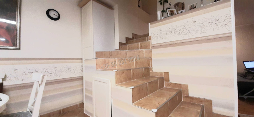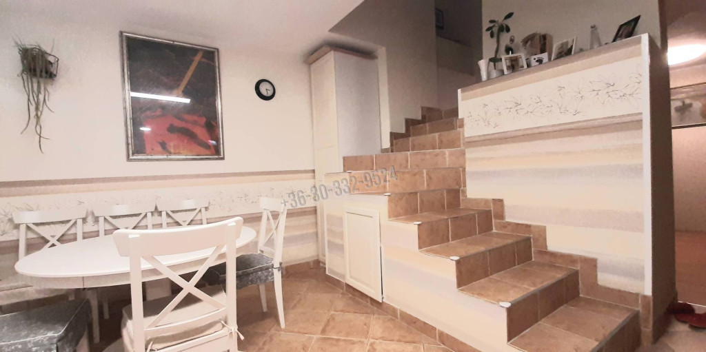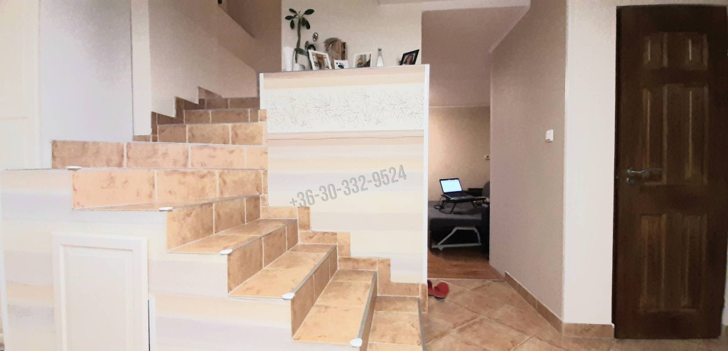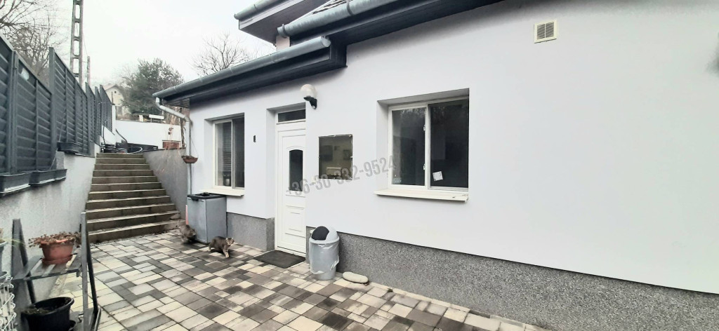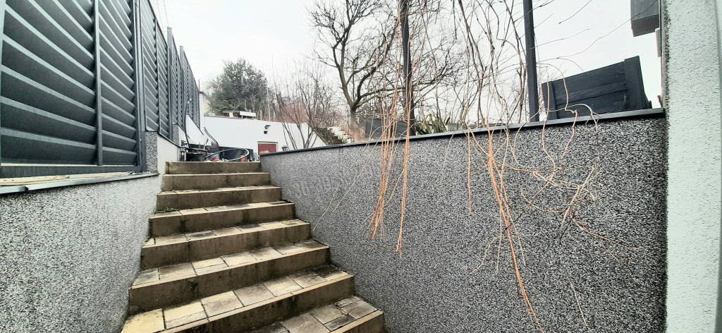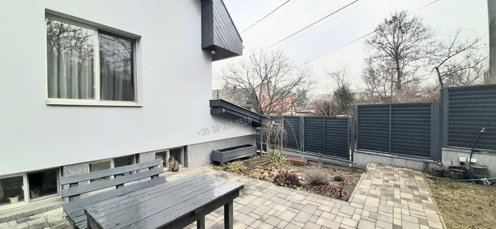 Az ingatlan kertjéhez egy hangulatos, kültéri lapokkal szépen megépített lépcső vezet, melyben virágzó bokrok, örökzöldek találhatók. Ebben a kis kertben helyet kapott még a kerti grill is és a nélkülözhetetlen kerti asztal a kis paddal.