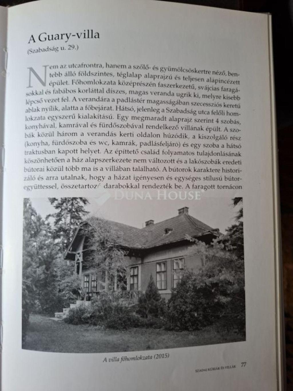 Guary- villa Szadán áron alul eladó! Az 1914-ben épült villa jelenlegi állapota felújítandó, de egy gyönyörű gyöngyszemet lehet belőle varázsolni. A telek 1242 m², rajta egy nettó 92 m² alapterületű villa, beépíthető tetőtérrel. Hozzá tartozik még egy 18 m²-es fedett terasz és egy 49 m² pince. A villa déli fele eladó. A ház melegét két álló cserépkályha biztosította, de bevezették a gázt is és gázkonvektorral is lehet fűteni az épületet. A villában 2 db 31 m² szoba található, illetve egy étkezős nappali, konyha, fürdő WC-vel. Budapesttől mindössze 18 km-re Gödöllő mellett található ez a kb. 5000 fős település. Villától a központ 400 méterre található, ahol iskola, óvoda, orvosi rendelő, posta, közért és egyéb más üzletek is megtalálhatók. M3-as autópálya 4-5 perc alatt elérhető.Az ingatlan, ha felkeltette az érdeklődését, hívjon bizalommal a hét bármely napján.