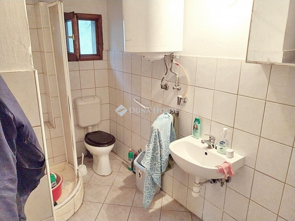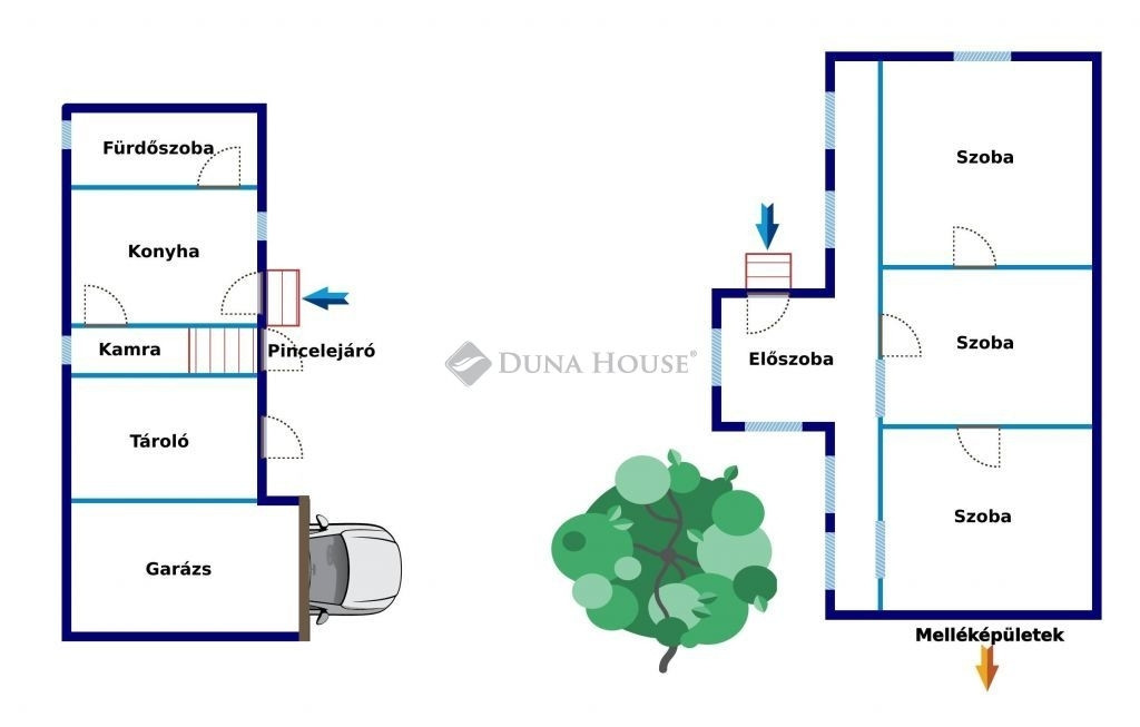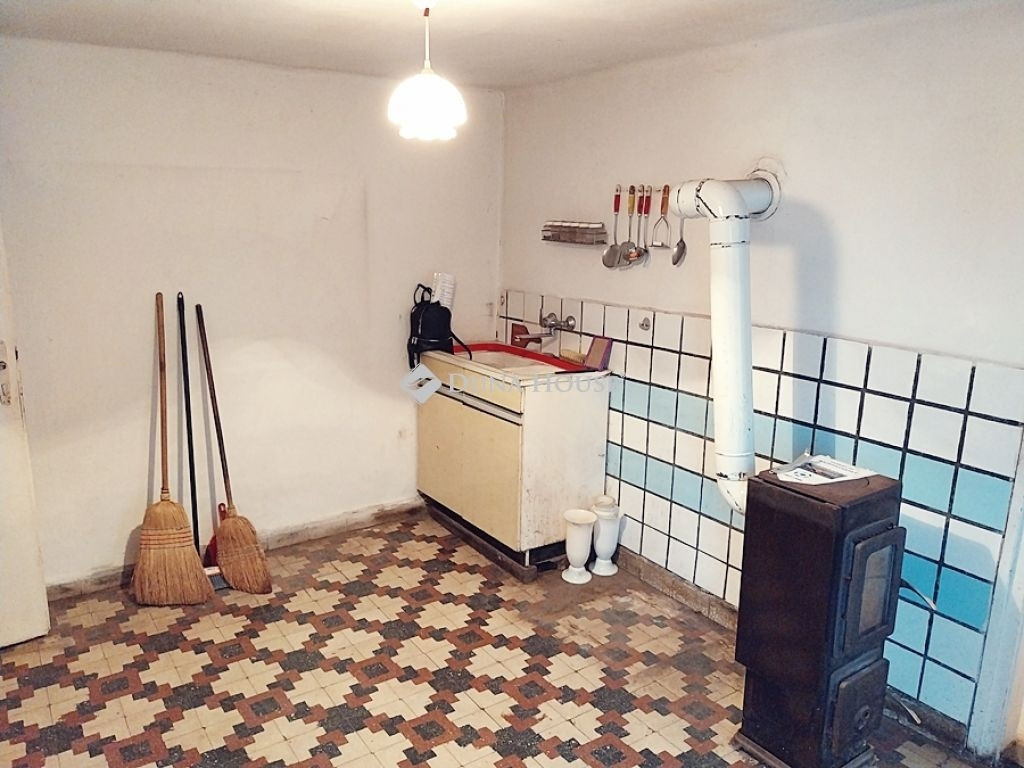 Az egyik épület (56 m2) helyiségei: konyha, kamra, fürdőszoba, pince, tároló, garázs.