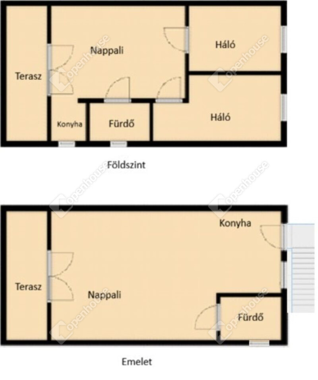 A földszint 29 nm, ahol található egy nappali, két hálószoba, fürdő és egy főzőfülke. A földszinthez tartozik egy 10 nm-es terasz.