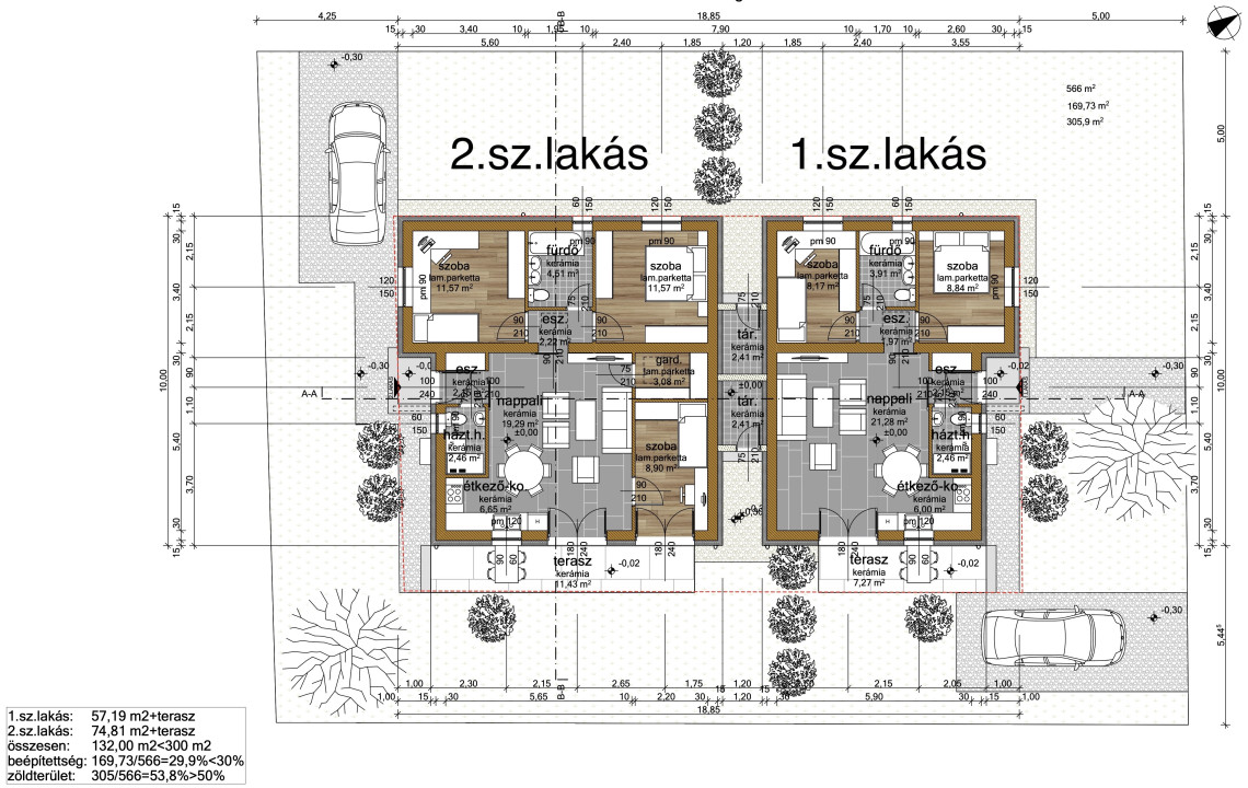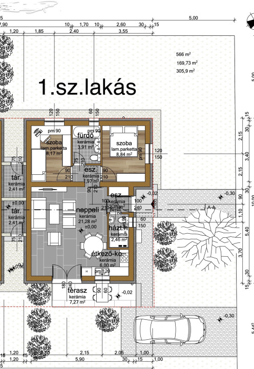 előszoba (2,15nm), háztartási helyiség + wc (2,46 nm), 2 szoba (8,17nm , 8,84nm) nappali (21,28nm) teraszkapcsolattal (7,27nm), konyha-étkező (6nm), fürdőszoba (3,91nm), közlekedő (1,97nm)