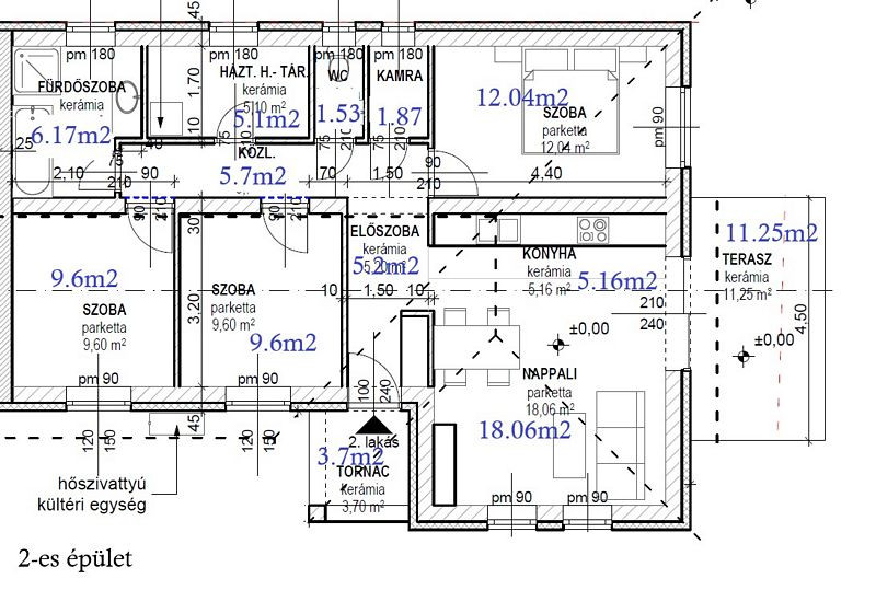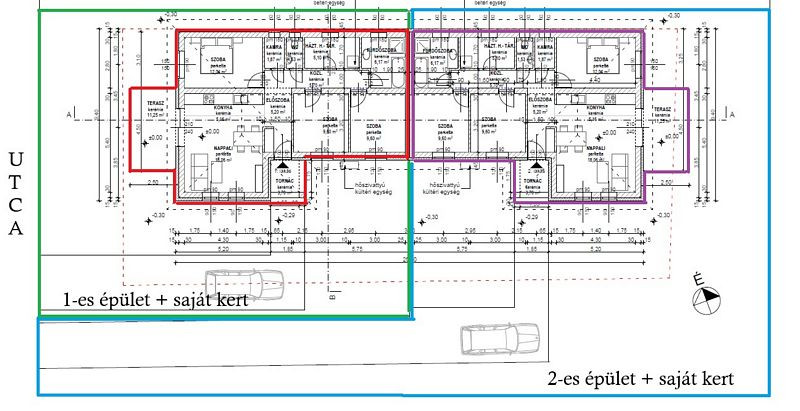Mindkét lakás egyforma, felosztásuk a következőképpen alakul (nettó 80.03m2 + 14.95m2 teraszok + saját kert / LAKÁS): elő - terasz (3.70m2), előszoba (5.20m2), konyha (5.16m2), nappali-étkező (18.06m2), kamra (1.87m2), wc (1.53m2), fürdőszoba (6.17m2), háztartási helyiség (5.10m2), közlekedő (5.70m2), 3 szoba (12.04m2, 9.60m2, 9.60m2), terasz (11.25m2).