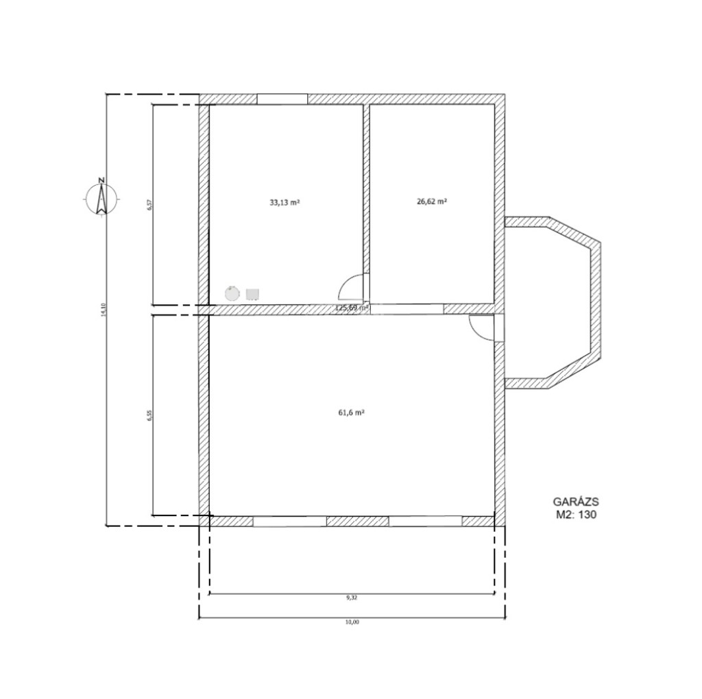 Garázs: 130 m2 nagyságú