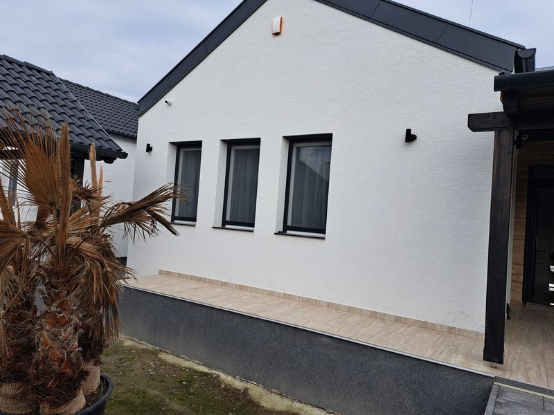 Szerkezeti leírás: Beton alap. Porotherm 30-as tégla főfalak + 15cm dryvit szigetelés. 10-es tégla válaszfalak. A külső nyílászárók műanyag szerkezetűek, fokozott hőszigetelésű üvegezéssel ellátva, elektromos redőnyökkel és szúnyoghálókkal felszerelve, márvány párkányokkal. Beton födém. Bramac cserép fedésű tető.