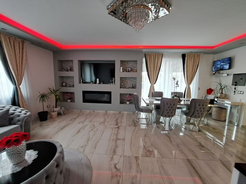 EXTRÁK: elektromos redőnyök, szúnyoghálók, napelem rendszer, 2 db. klíma, riasztó - kamera rendszer, led díszvilágítások, elektromos kandalló, beépített - gépesített konyhabútor (indukciós főzőlap, sütő, páraelszívó, mikró, beépített szemetes), elektromos nagykapu, kerti csap, kuka tároló.