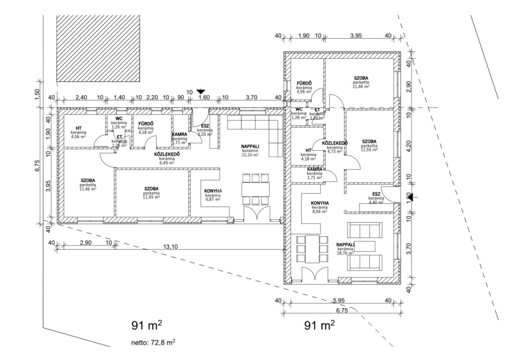 2.lakás: bruttó 91 nm, nettó 72,8 nm + 6 nm terasz