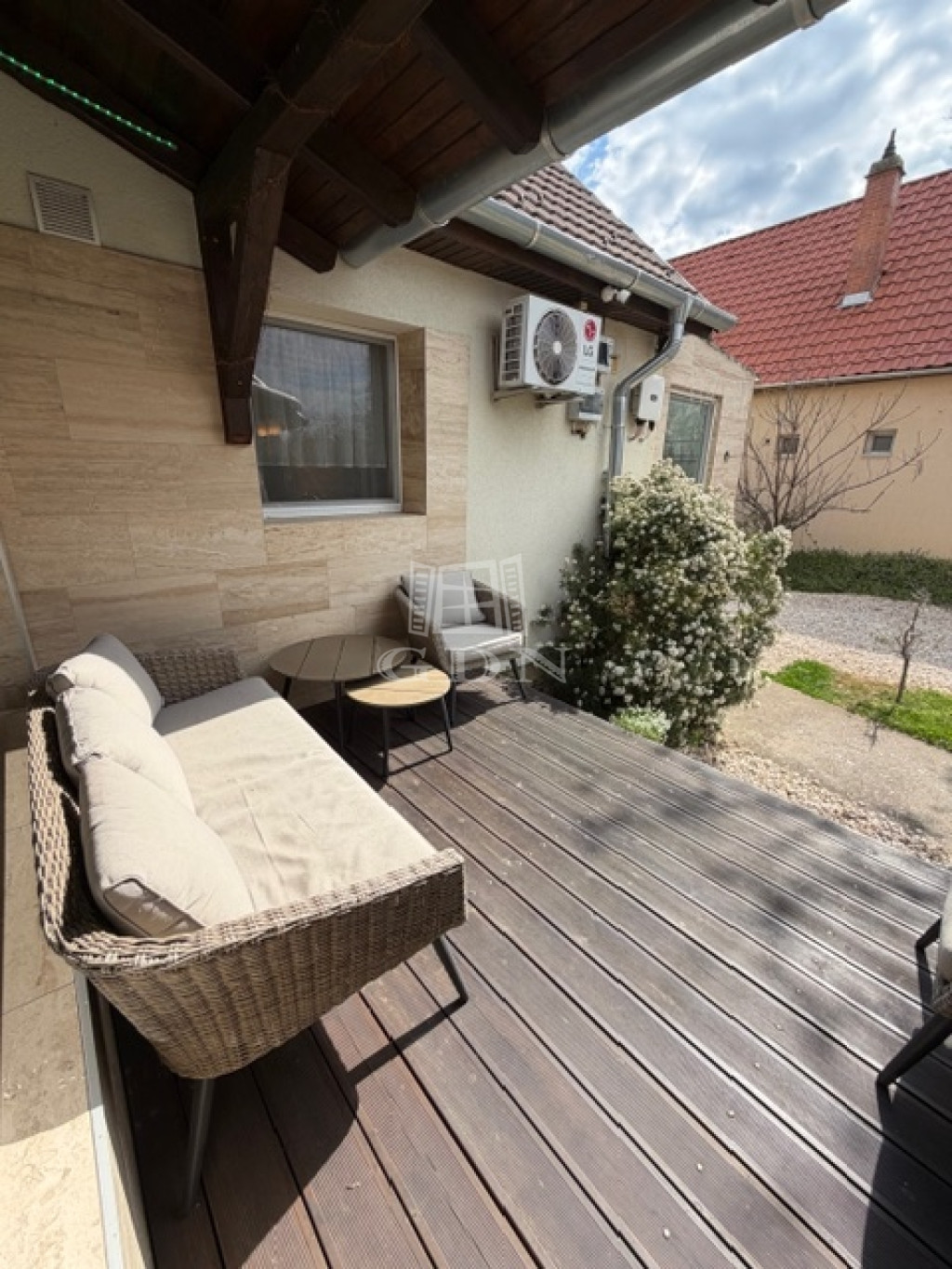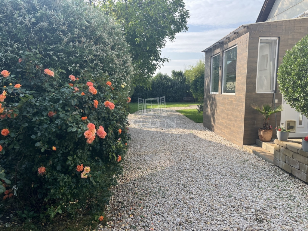 A főépület 100 m2, nappali + 2 hálószobás, nagy gardrob szobával, különleges hangulatú, modern fürdőszobával, gépesített praktikus konyhával és a szülői hálóból nyíló hangulatos terasszal.