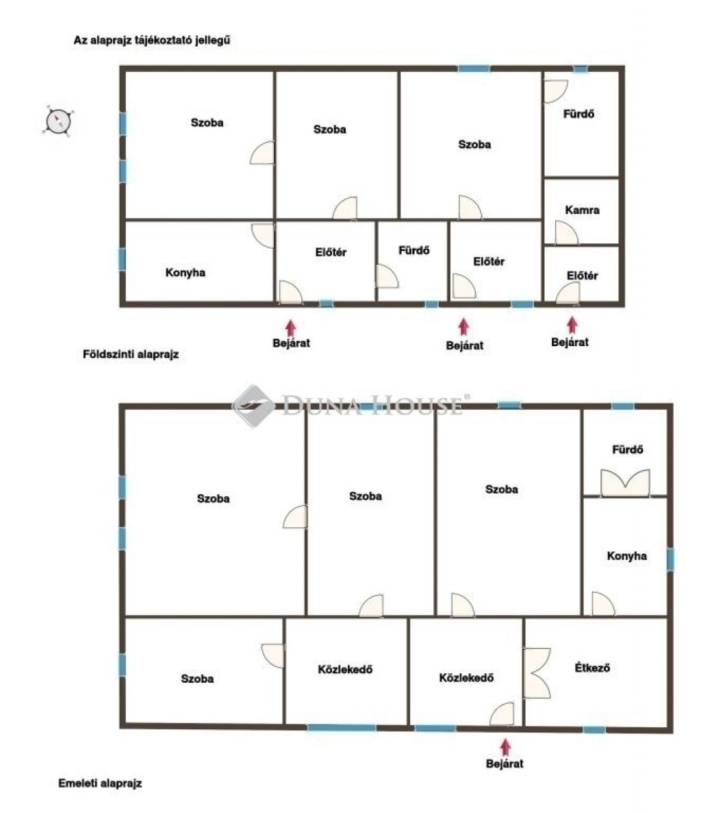 Felső szint: 4 szoba, konyha, fürdő, kamra, étkező, közlekedő