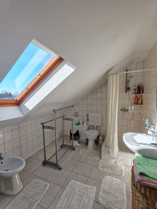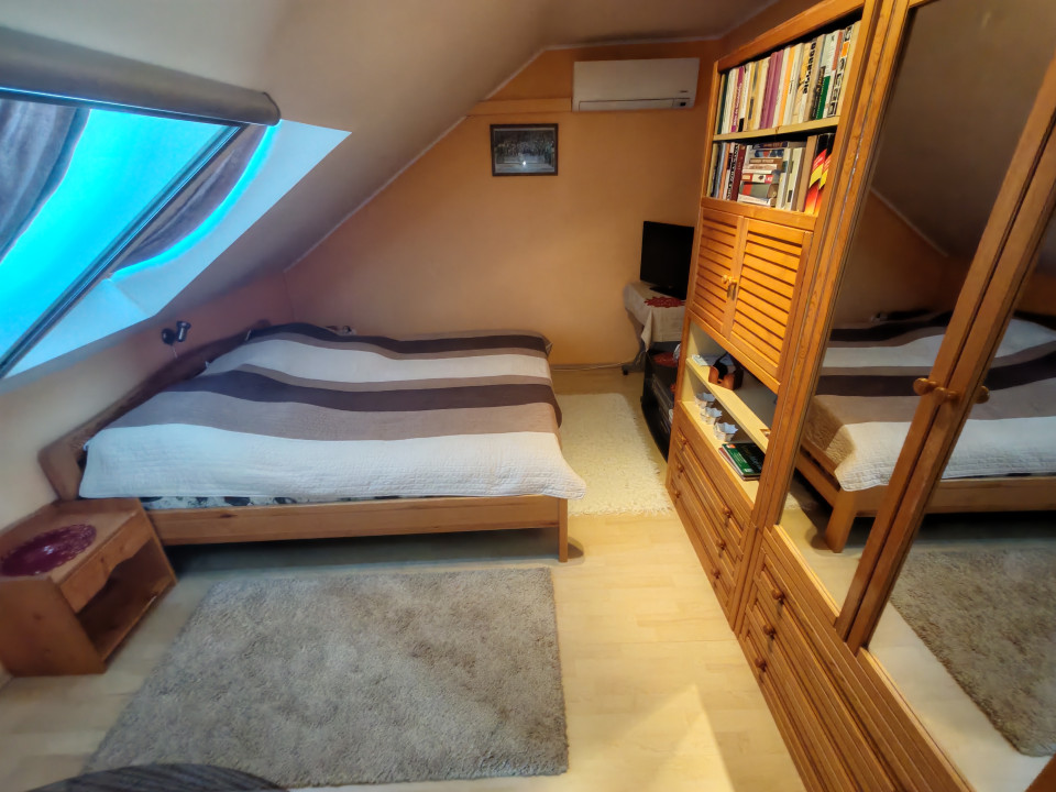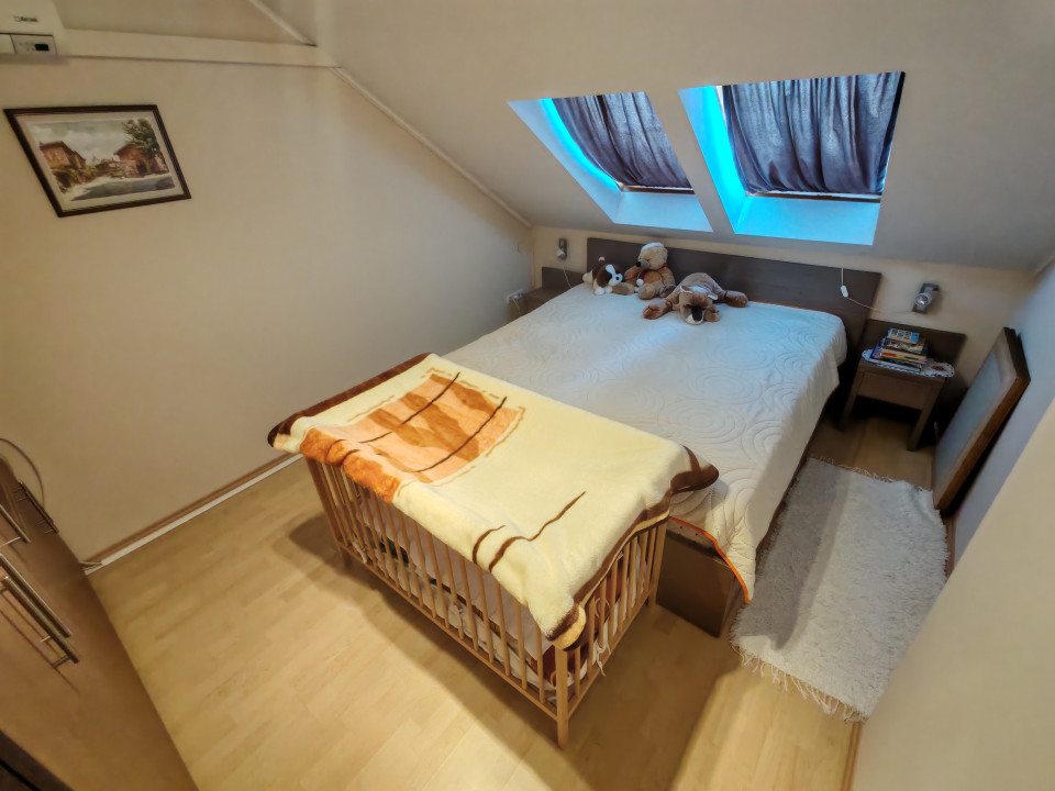 A tetőtérben két hálószoba, egy nagy méretű fürdőszoba WC-vel, és egy külön gardróbszoba, valamint beépített szekrények biztosítják a kényelmes használatot és a praktikus tárolást.
