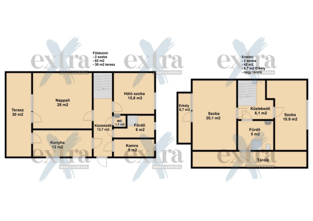 • 125 m2 nettó alapterületű (földszint 82 m2, emelet 43 m2) 150+ m2 bruttó lakóterület
