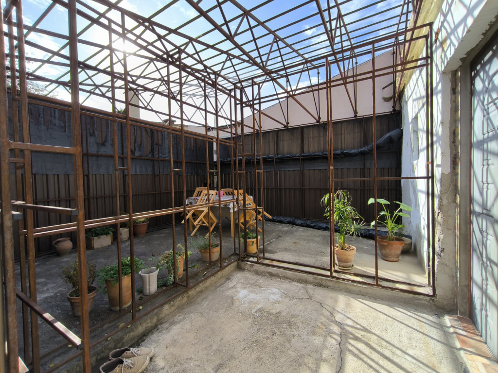 A bejárat előtt található 25m2 méretű terasz, a meglévő zártszelvény vázszerkezet felhasználásával akár télikerté is alakítható. A 320 m2 alapterületű udvarban található egy kb. 20 m2 alapterületű melléképület, amely műhelyként és tárolóként is funkcionálhat.