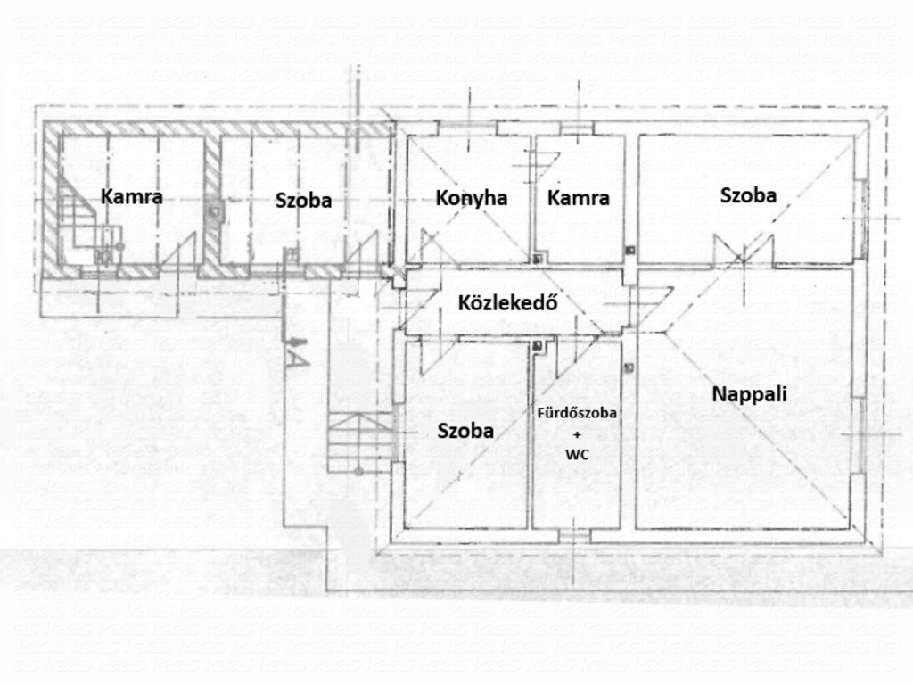 • helyiségek: előszoba, konyha/étkező, 4 szoba, fürdő/wc, kamra