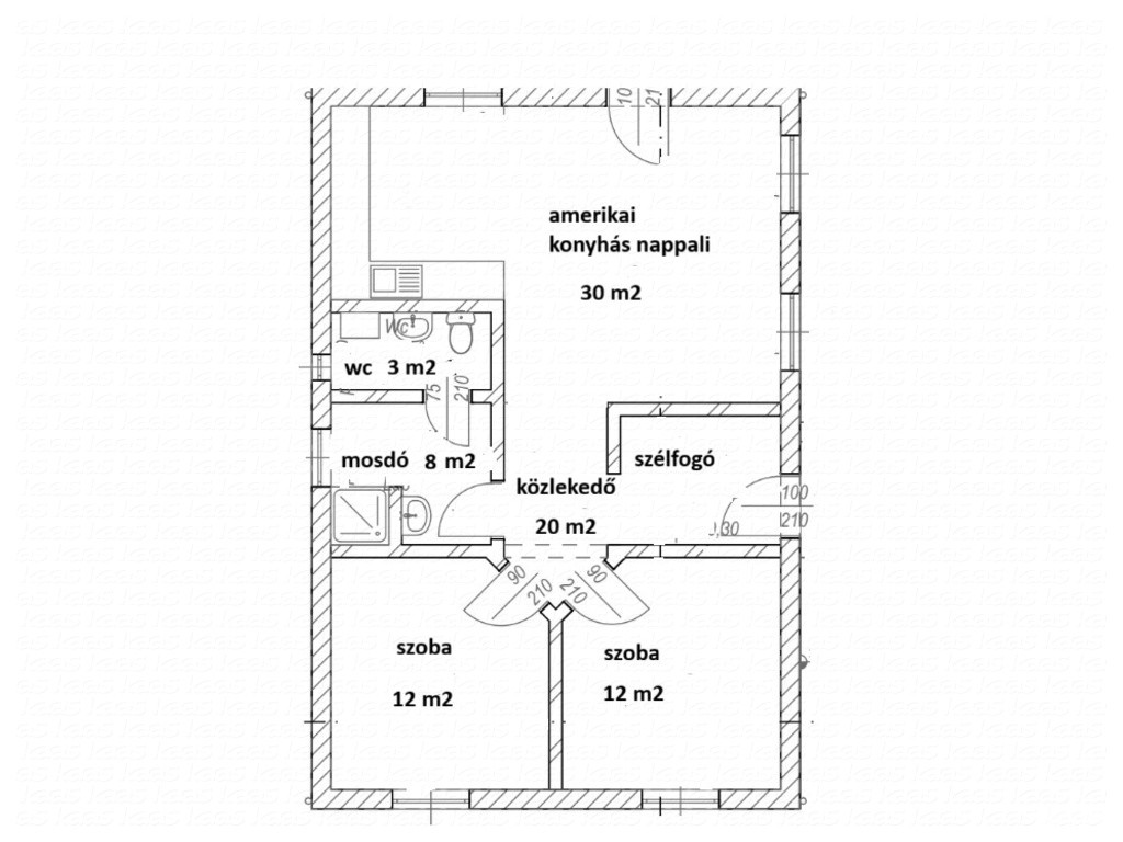 Helységek: amerikai konyhás nappali, 2 hálószoba, fürdő, wc, közlekedő, szélfogó, terasz, autóbeálló uszókapuval