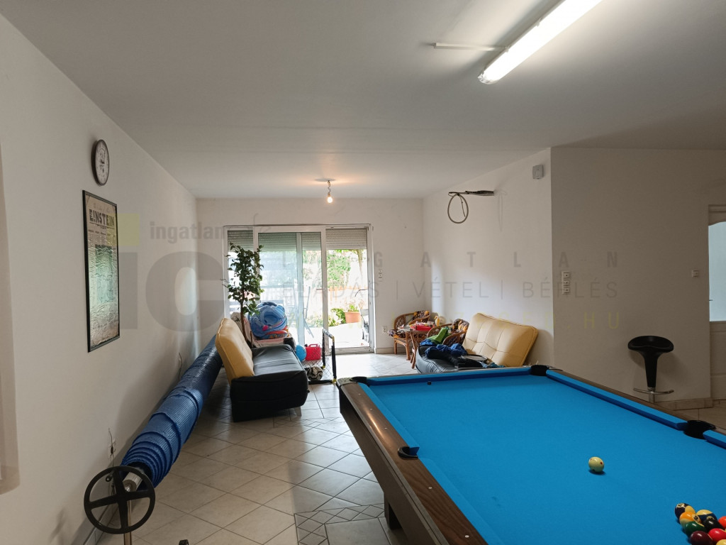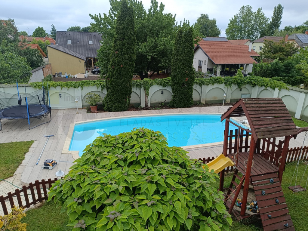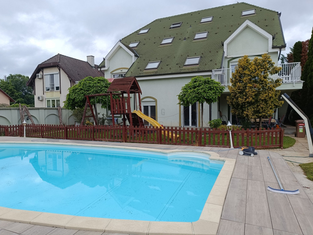 A parkosított közös udvarban egy 5*10 m-es medence biztosítja a nyári hűsölést, mellette kerti sütővel, gyerekjátékokkal.