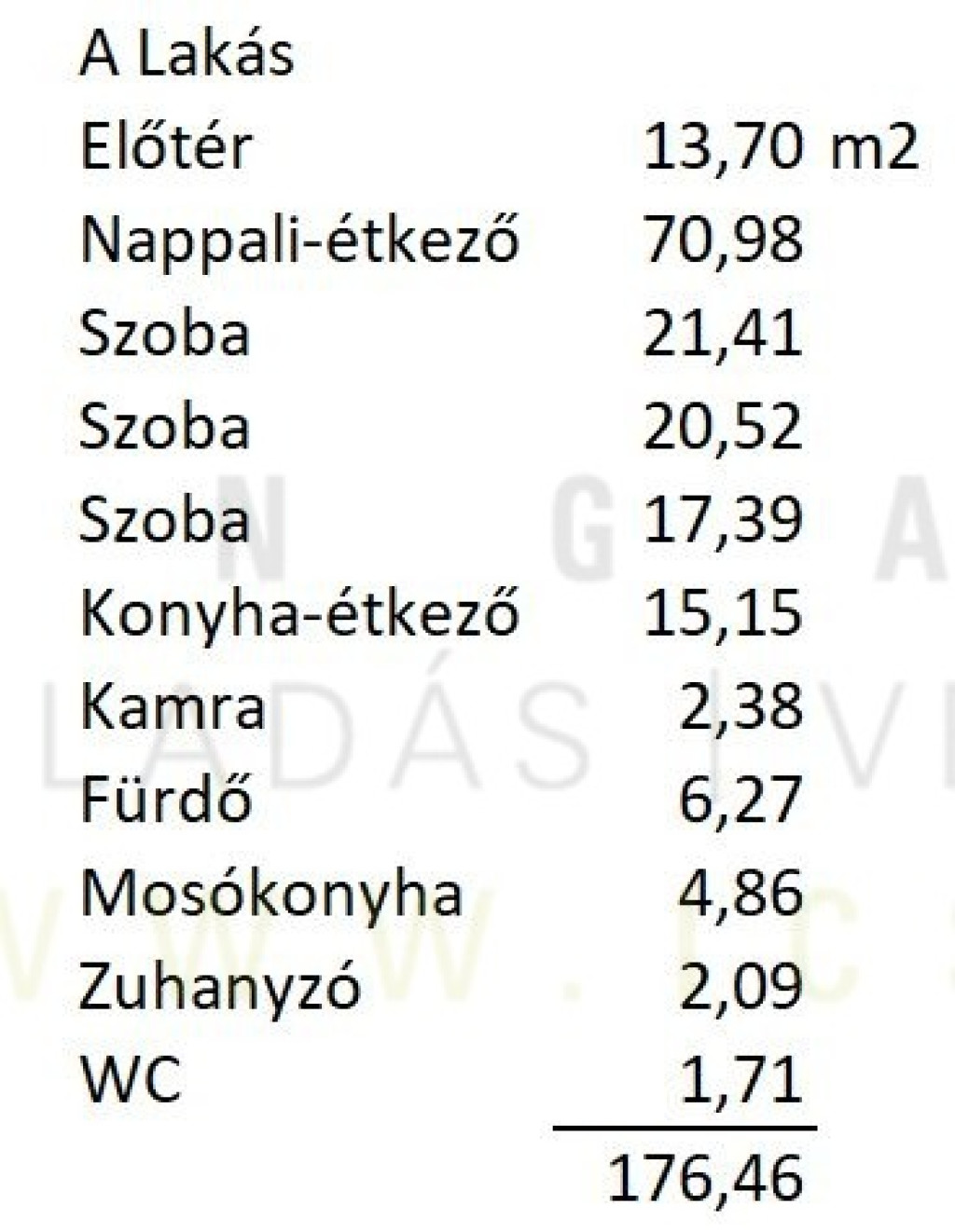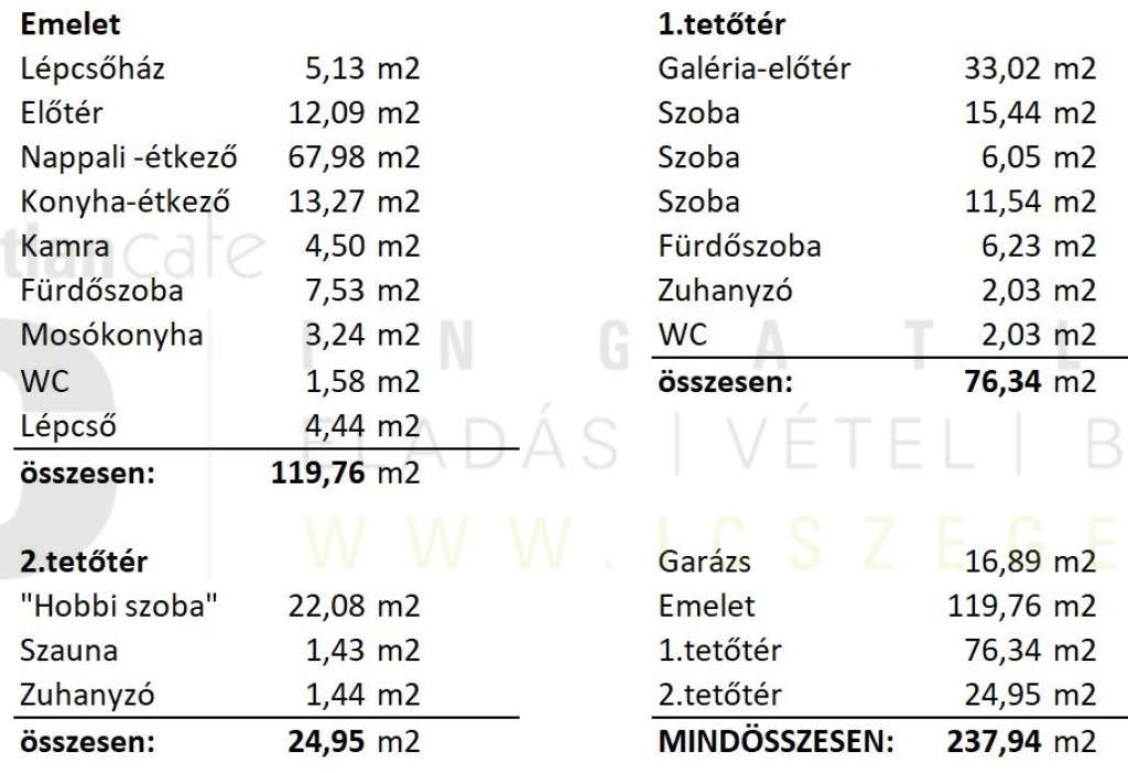 A földszinti (A) lakás garázzsal együtt 197 m2, a két szimmetrikus lakás a garázzsal együtt összesen nettó 238-238 m2. Mindhárom lakás hangulatát meghatározza a hatalmas étkezőkonyhás nappali. Az emeleti lakások tágas, udvarra néző erkéllyel rendelkeznek (melyhez külső lépcsőt is kialakítottak, az udvar egyszerűbb megközelítése miatt), ezen a szinten van egy sarkokkádas fürdőszoba, háztartási helyiség a kazánokkal, wc. Az első tetőtéri szinten 3 hálószoba, szintén sarokkádas fürdőszobával, zuhanykabinos wc-vel, a felső tetőréi szinten egy egybefüggő szoba, a hozzátartozó zuhanyzós wc-vel.