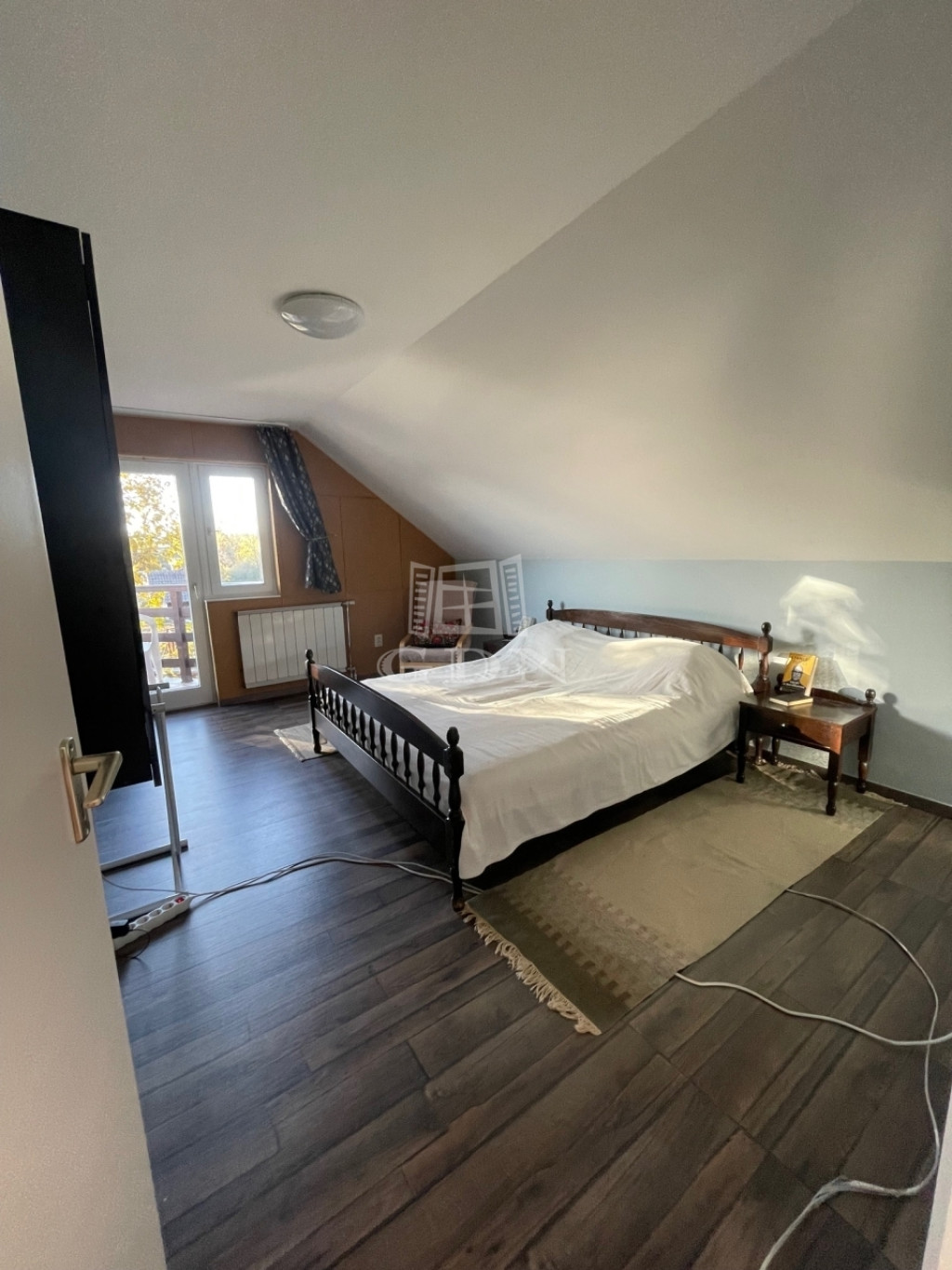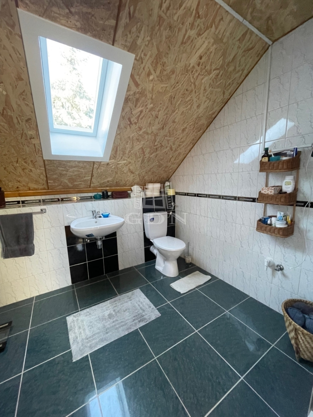 Az emeleti szinten galériás előtér, tágas nappali, két hálószoba, zuhanyzós fürdőszoba (300 literes puffertartállyal) és gardrób található.